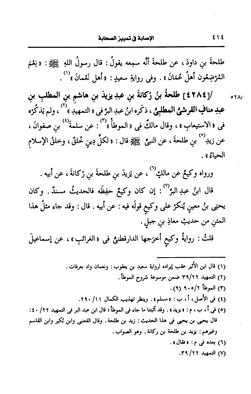 4284- طلحة بن ركانة بن عبد يزيد بن هاشم بن المطلب بن عبد مناف، القُرشِيّ المطلبي.