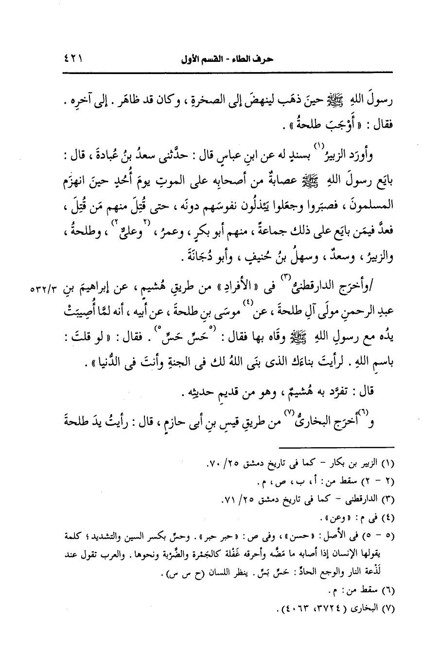 قال تَفَرَّدَ به هشيم وهو من قديم حديثه أخرج البُخارِيّ من طريق قيس بن أبي حازم، قال: رَأيتُ يد طلحة شلاء وقى بها رسول الله صَلى الله عَلَيه وسَلم يوم أحد.