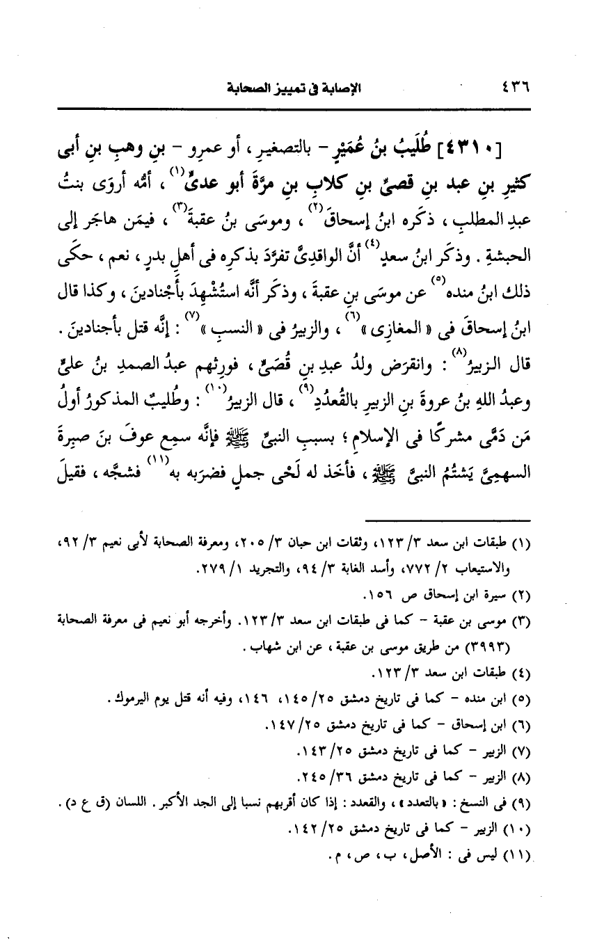 4310- طليب بن عمير بالتصغير أو عَمرو بن وهب بن أبي كثير بن عبد بن قصي بن كلاب بن مرة أَبو عدي أمه أروى بنت عبد المطلب.