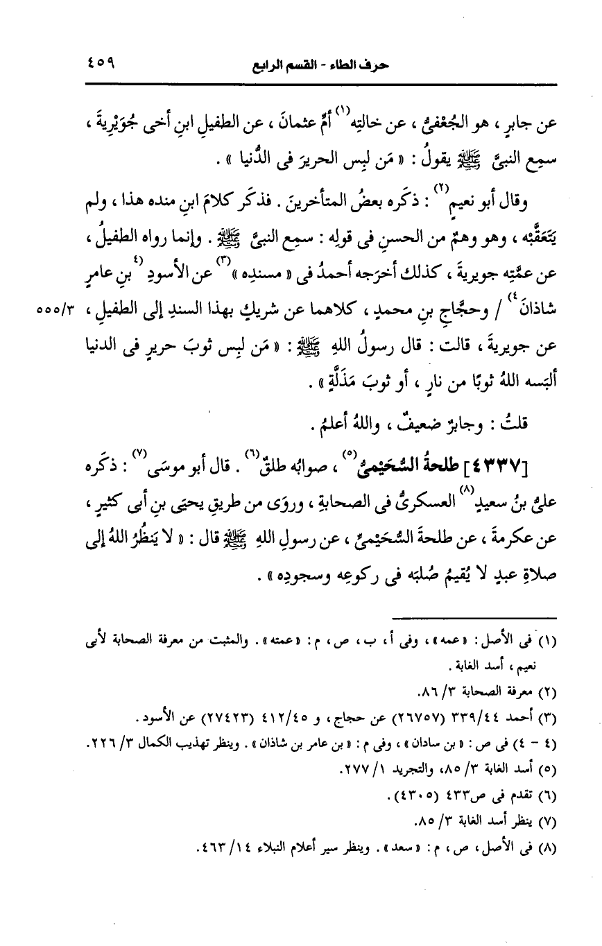 قال أَبو موسى: ذكره علي ابن سَعد العسكري في الصحابة وروى من طريق يحيى بن أبي كثير، عَن عكرمة، عَن طلحة السحيمي، عَن رسول الله صَلى الله عَلَيه وسَلم قال لا ينظر الله إلى صلاة عبد لا يقيم صلبه في ركوعه وسجوده.