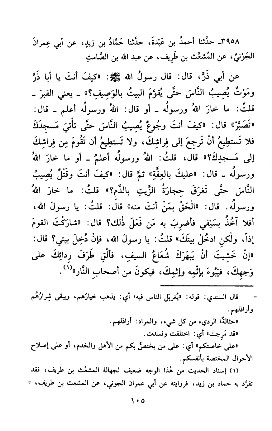 3958- حَدَّثَنَا أَحْمَدُ بْنُ عَبْدَةَ ، حَدَّثَنَا حَمَّادُ بْنُ زَيْدٍ ، عَنْ أَبِي عِمْرَانَ الْجَوْنِيِّ ، عَنِ الْمُشَعَّثِ بْنِ طَرِيفٍ ، عَنْ عَبْدِ اللهِ بْنِ الصَّامِتِ ، عَنْ أَبِي ذَرٍّ ، قَالَ : قَالَ رَسُولُ اللهِ صَلَّى الله عَليْهِ وسَلَّمَ : كَيْفَ أَنْتَ يَا أَبَا ذَرٍّ وَمَوْتًا يُصِيبُ النَّاسَ حَتَّى يُقَوَّمَ الْبَيْتُ بِالْوَصِيفِ ؟ يَعْنِي الْقَبْرَ ، قُلْتُ : مَا خَارَ اللَّهُ لِي وَرَسُولُهُ ، أَوْ قَالَ : اللَّهُ وَرَسُولُهُ أَعْلَمُ ، قَالَ : تَصَبَّرْ قَالَ : كَيْفَ أَنْتَ ، وَجُوعًا يُصِيبُ النَّاسَ ، حَتَّى تَأْتِيَ مَسْجِدَكَ فَلاَ تَسْتَطِيعَ أَنْ تَرْجِعَ إِلَى فِرَاشِكَ ، وَلاَ تَسْتَطِيعَ أَنْ تَقُومَ مِنْ فِرَاشِكَ إِلَى مَسْجِدِكَ ؟ قَالَ : قُلْتُ : اللَّهُ وَرَسُولُهُ أَعْلَمُ ، أَوْ مَا خَارَ اللَّهُ لِي وَرَسُولُهُ ، قَالَ : عَلَيْكَ بِالْعِفَّةِ ثُمَّ قَالَ : كَيْفَ أَنْتَ ، وَقَتْلاً يُصِيبُ النَّاسَ حَتَّى تُغْرَقَ حِجَارَةُ الزَّيْتِ بِالدَّمِ ؟ قُلْتُ : مَا خَارَ اللَّهُ لِي وَرَسُولُهُ ، قَالَ : الْحَقْ بِمَنْ أَنْتَ مِنْهُ ، قَالَ : قُلْتُ : يَا رَسُولَ اللهِ ، أَفَلاَ آخُذُ بِسَيْفِي ، فَأَضْرِبَ بِهِ مَنْ فَعَلَ ذَلِكَ ، قَالَ : شَارَكْتَ الْقَوْمَ إِذًا ، وَلَكِنِ ادْخُلْ بَيْتَكَ ، قُلْتُ : يَا رَسُولَ اللهِ ، فَإِنْ دُخِلَ بَيْتِي ؟ قَالَ : إِنْ خَشِيتَ أَنْ يَبْهَرَكَ شُعَاعُ السَّيْفِ ، فَأَلْقِ طَرَفَ رِدَائِكَ عَلَى وَجْهِكَ ، فَيَبُوءَ بِإِثْمِهِ وَإِثْمِكَ ، فَيَكُونَ مِنْ أَصْحَابِ النَّارِ.