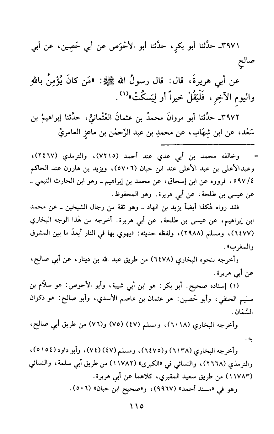 3971- حَدَّثَنَا أَبُو بَكْرٍ ، حَدَّثَنَا أَبُو الأَحْوَصِ ، عَنْ أَبِي حَصِينٍ ، عَنْ أَبِي صَالِحٍ ، عَنْ أَبِي هُرَيْرَةَ ، قَالَ : قَالَ رَسُولُ اللهِ صَلَّى الله عَليْهِ وسَلَّمَ : مَنْ كَانَ يُؤْمِنُ بِاللَّهِ وَالْيَوْمِ الآخِرِ ، فَلْيَقُلْ خَيْرًا أَوْ لِيَسْكُتْ.