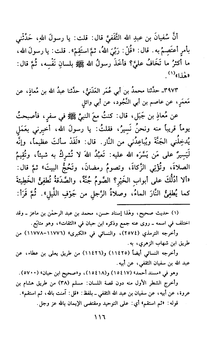 3973- حَدَّثَنَا مُحَمَّدُ بْنُ أَبِي عُمَرَ الْعَدَنِيُّ ، حَدَّثَنَا عَبْدُ اللهِ بْنُ مُعَاذٍ ، عَنْ مَعْمَرٍ ، عَنْ عَاصِمِ بْنِ أَبِي النُّجُودِ ، عَنْ أَبِي وَائِلٍ ، عَنْ مُعَاذِ بْنِ جَبَلٍ ، قَالَ : كُنْتُ مَعَ النَّبِيِّ صَلَّى الله عَليْهِ وسَلَّمَ فِي سَفَرٍ ، فَأَصْبَحْتُ يَوْمًا قَرِيبًا مِنْهُ وَنَحْنُ نَسِيرُ ، فَقُلْتُ : يَا رَسُولَ اللهِ ، أَخْبِرْنِي بِعَمَلٍ يُدْخِلُنِي الْجَنَّةَ ، وَيُبَاعِدُنِي مِنَ النَّارِ ، قَالَ : لَقَدْ سَأَلْتَ عَظِيمًا ، وَإِنَّهُ لَيَسِيرٌ عَلَى مَنْ يَسَّرَهُ اللَّهُ عَلَيْهِ ، تَعْبُدُ اللَّهَ لاَ تُشْرِكُ بِهِ شَيْئًا ، وَتُقِيمُ الصَّلاَةَ ، وَتُؤْتِي الزَّكَاةَ ، وَتَصُومُ رَمَضَانَ ، وَتَحُجَّ الْبَيْتَ ثُمَّ أَلاَ أَدُلُّكَ عَلَى أَبْوَابِ الْخَيْرِ ؟ الصَّوْمُ جُنَّةٌ ، وَالصَّدَقَةُ تُطْفِئُ الْخَطِيئَةَ كَمَا يُطْفِئُ النَّارَ الْمَاءُ ، وَصَلاَةُ الرَّجُلِ فِي جَوْفِ اللَّيْلِ ، ثُمَّ قَرَأَ {تَتَجَافَى جُنُوبُهُمْ عَنِ الْمَضَاجِعِ} حَتَّى بَلَغَ {جَزَاءً بِمَا كَانُوا يَعْمَلُونَ}.