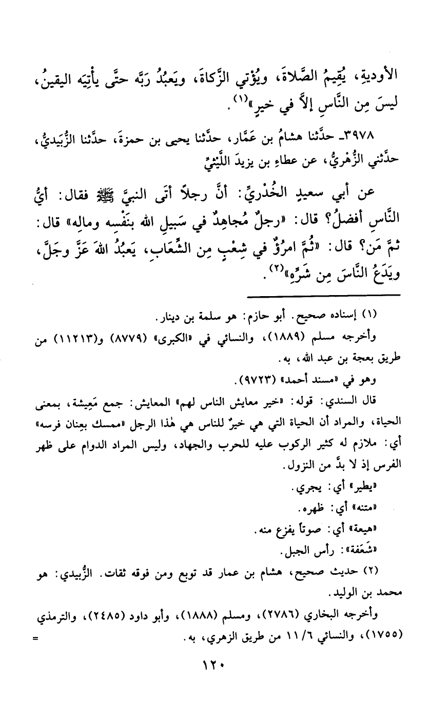 3978- حَدَّثَنَا هِشَامُ بْنُ عَمَّارٍ ، حَدَّثَنَا يَحْيَى بْنُ حَمْزَةَ ، حَدَّثَنَا الزَّبِيدِيُّ , حَدَّثَنِي الزُّهْرِيُّ ، عَنْ عَطَاءِ بْنِ يَزِيدَ اللَّيْثِيِّ ، عَنْ أَبِي سَعِيدٍ الْخُدْرِيِّ ، أَنَّ رَجُلاً أَتَى النَّبِيَّ صَلَّى الله عَليْهِ وسَلَّمَ ، فَقَالَ : أَيُّ النَّاسِ أَفْضَلُ ؟ قَالَ : رَجُلٌ مُجَاهِدٌ فِي سَبِيلِ اللهِ بِنَفْسِهِ ، وَمَالِهِ ، قَالَ : ثُمَّ مَنْ ؟ قَالَ : ثُمَّ امْرُؤٌ فِي شِعْبٍ مِنَ الشِّعَابِ ، يَعْبُدُ اللَّهَ عَزَّ وَجَلَّ ، وَيَدَعُ النَّاسَ مِنْ شَرِّهِ.