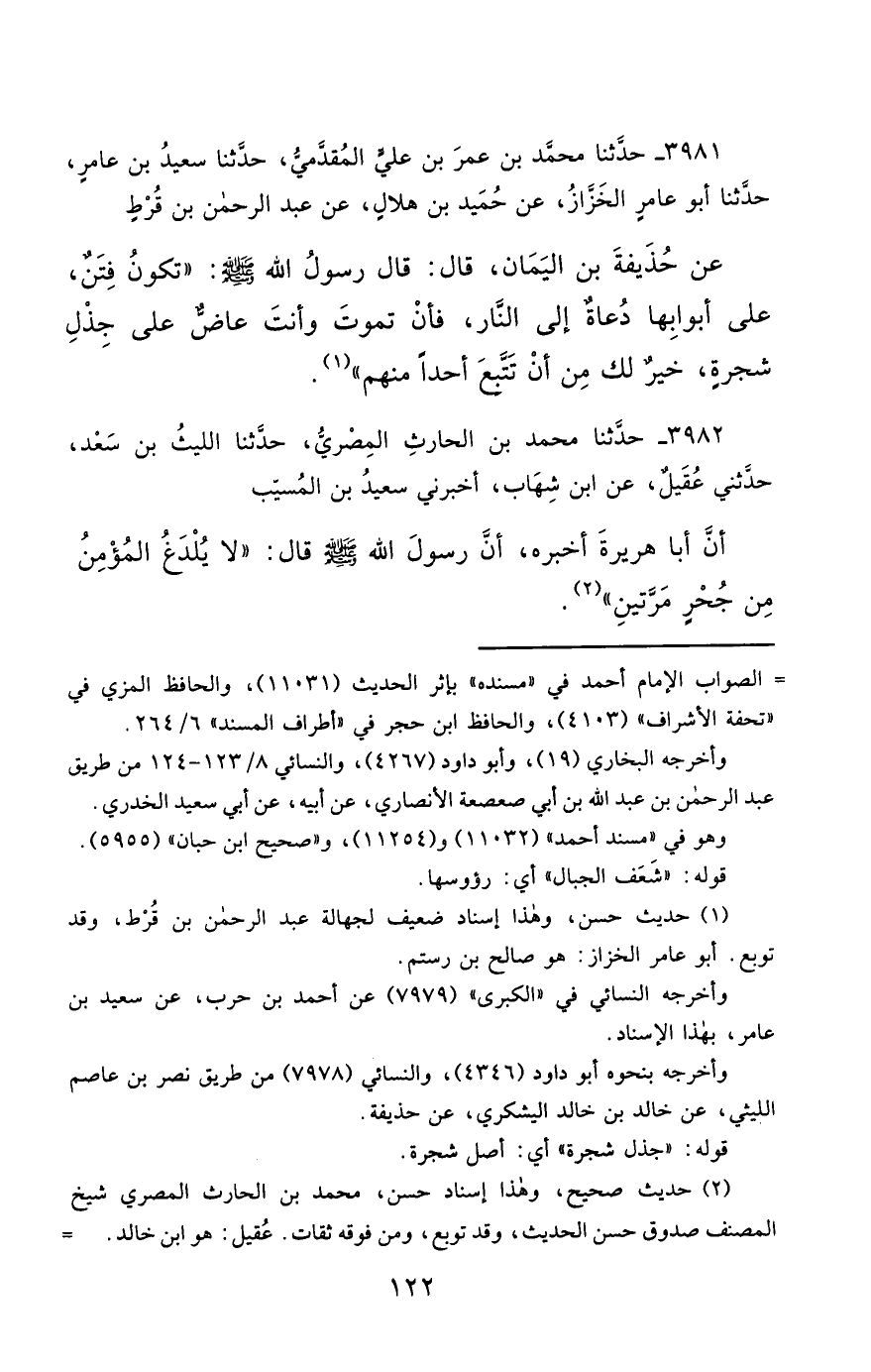 3981- حَدَّثَنَا مُحَمَّدُ بْنُ عُمَرَ بْنِ عَلِيٍّ الْمُقَدِّمِيُّ ، حَدَّثَنَا سَعِيدُ بْنُ عَامِرٍ ، حَدَّثَنَا أَبُو عَامِرٍ الْخَزَّازُ ، عَنْ حُمَيْدِ بْنِ هِلاَلٍ ، عَنْ عَبْدِ الرَّحْمَنِ بْنِ قُرْطٍ ، عَنْ حُذَيْفَةَ بْنِ الْيَمَانِ ، قَالَ : قَالَ رَسُولُ اللهِ صَلَّى الله عَليْهِ وسَلَّمَ : تَكُونُ فِتَنٌ عَلَى أَبْوَابِهَا دُعَاةٌ إِلَى النَّارِ ، فَأَنْ تَمُوتَ وَأَنْتَ عَاضٌّ عَلَى جِذْلِ شَجَرَةٍ ، خَيْرٌ لَكَ مِنْ أَنْ تَتْبَعَ أَحَدًا مِنْهُمْ.