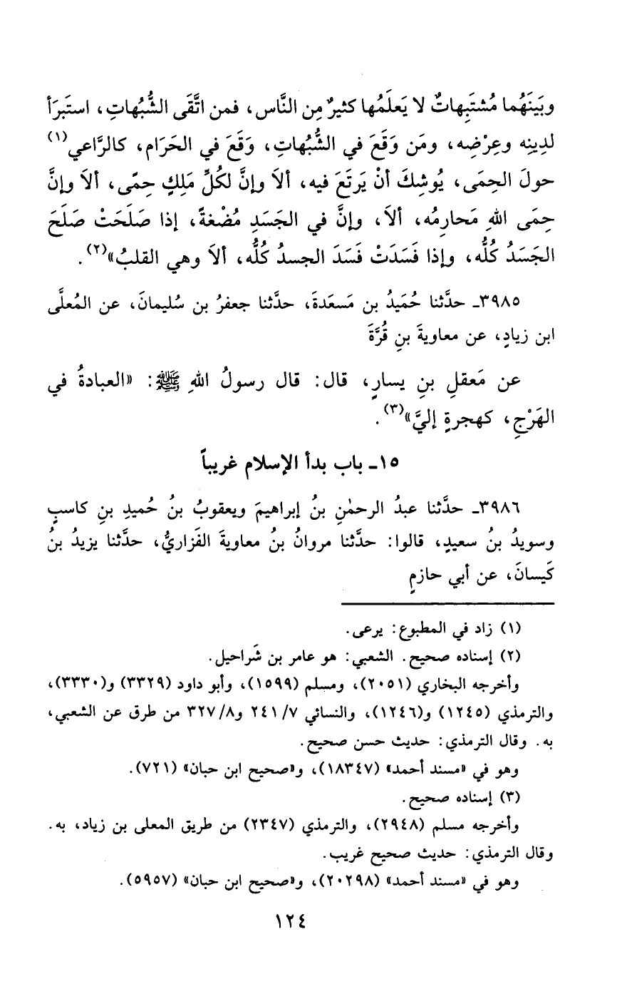 3986- حَدَّثَنَا عَبْدُ الرَّحْمَنِ بْنُ إِبْرَاهِيمَ ، وَيَعْقُوبُ بْنُ حُمَيْدِ بْنِ كَاسِبٍ ، وَسُوَيْدُ بْنُ سَعِيدٍ ، قَالُوا : حَدَّثَنَا مَرْوَانُ بْنُ مُعَاوِيَةَ الْفَزَارِيُّ ، حَدَّثَنَا يَزِيدُ بْنُ كَيْسَانَ ، عَنْ أَبِي حَازِمٍ ، عَنْ أَبِي هُرَيْرَةَ ، قَالَ : قَالَ رَسُولُ اللهِ صَلَّى الله عَليْهِ وسَلَّمَ : بَدَأَ الإِسْلاَمُ غَرِيبًا ، وَسَيَعُودُ غَرِيبًا ، فَطُوبَى لِلْغُرَبَاءِ.