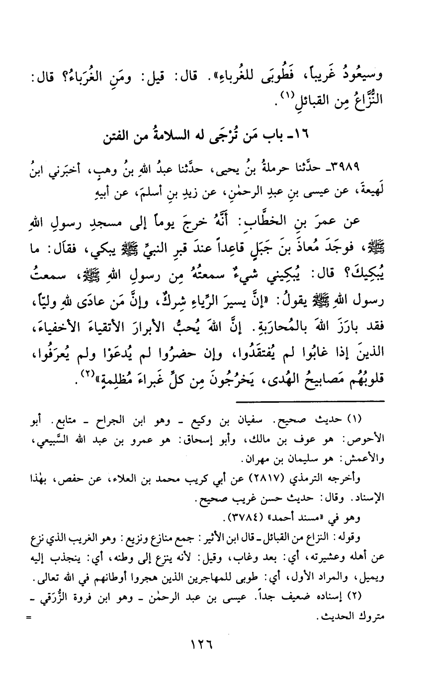 3989- حَدَّثَنَا حَرْمَلَةُ بْنُ يَحْيَى ، حَدَّثَنَا عَبْدُ اللهِ بْنُ وَهْبٍ ، أَخْبَرَنِي ابْنُ لَهِيعَةَ ، عَنْ عِيسَى بْنِ عَبْدِ الرَّحْمَنِ ، عَنْ زَيْدِ بْنِ أَسْلَمَ ، عَنْ أَبِيهِ ، عَنْ عُمَرَ بْنِ الْخَطَّابِ ، أَنَّهُ خَرَجَ يَوْمًا إِلَى مَسْجِدِ رَسُولِ اللهِ صَلَّى الله عَليْهِ وسَلَّمَ ، فَوَجَدَ مُعَاذَ بْنَ جَبَلٍ قَاعِدًا عِنْدَ قَبْرِ النَّبِيِّ صَلَّى الله عَليْهِ وسَلَّمَ يَبْكِي ؟ فَقَالَ : مَا يُبْكِيكَ ؟ قَالَ : يُبْكِينِي شَيْءٌ سَمِعْتُهُ مِنْ رَسُولِ اللهِ صَلَّى الله عَليْهِ وسَلَّمَ ، سَمِعْتُ رَسُولَ اللهِ صَلَّى الله عَليْهِ وسَلَّمَ ، يَقُولُ : إِنَّ يَسِيرَ الرِّيَاءِ شِرْكٌ ، وَإِنَّ مَنْ عَادَى لِلَّهِ وَلِيًّا ، فَقَدْ بَارَزَ اللَّهَ بِالْمُحَارَبَةِ ، إِنَّ اللَّهَ يُحِبُّ الأَبْرَارَ الأَتْقِيَاءَ الأَخْفِيَاءَ ، الَّذِينَ إِذَا غَابُوا لَمْ يُفْتَقَدُوا ، وَإِنْ حَضَرُوا لَمْ يُدْعَوْا وَلَمْ يُعْرَفُوا , قُلُوبُهُمْ مَصَابِيحُ الْهُدَى ، يَخْرُجُونَ مِنْ كُلِّ غَبْرَاءَ مُظْلِمَةٍ.