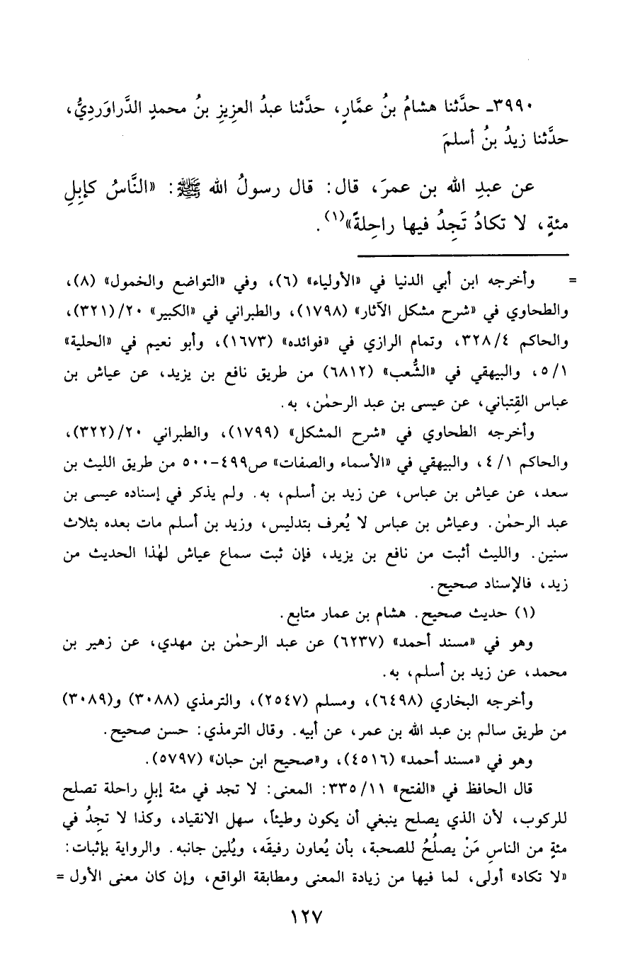 3990- حَدَّثَنَا هِشَامُ بْنُ عَمَّارٍ ، حَدَّثَنَا عَبْدُ الْعَزِيزِ بْنُ مُحَمَّدٍ الدَّرَاوَرْدِيُّ ، حَدَّثَنَا زَيْدُ بْنُ أَسْلَمَ ، عَنْ عَبْدِ اللهِ بْنِ عُمَرَ ، قَالَ : قَالَ رَسُولُ اللهِ صَلَّى الله عَليْهِ وسَلَّمَ : النَّاسُ كَإِبِلٍ مِئَةٍ ، لاَ تَكَادُ تَجِدُ فِيهَا رَاحِلَةً.