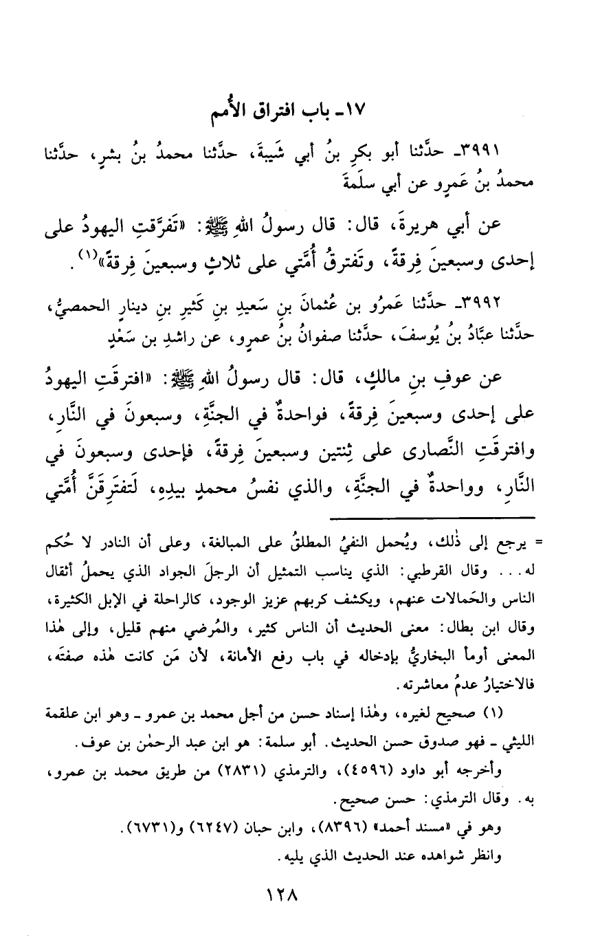 3991- حَدَّثَنَا أَبُو بَكْرِ بْنُ أَبِي شَيْبَةَ ، حَدَّثَنَا مُحْمَّدُ بْنُ بِشْرٍ ، حَدَّثَنَا مُحَمَّدُ بْنُ عَمْرٍو ، عَنْ أَبِي سَلَمَةَ ، عَنْ أَبِي هُرَيْرَةَ ، قَالَ : قَالَ رَسُولُ اللهِ صَلَّى الله عَليْهِ وسَلَّمَ : تَفَرَّقَتِ الْيَهُودُ عَلَى إِحْدَى وَسَبْعِينَ فِرْقَةً ، وَتَفْتَرِقُ أُمَّتِي عَلَى ثَلاَثٍ وَسَبْعِينَ فِرْقَةً.