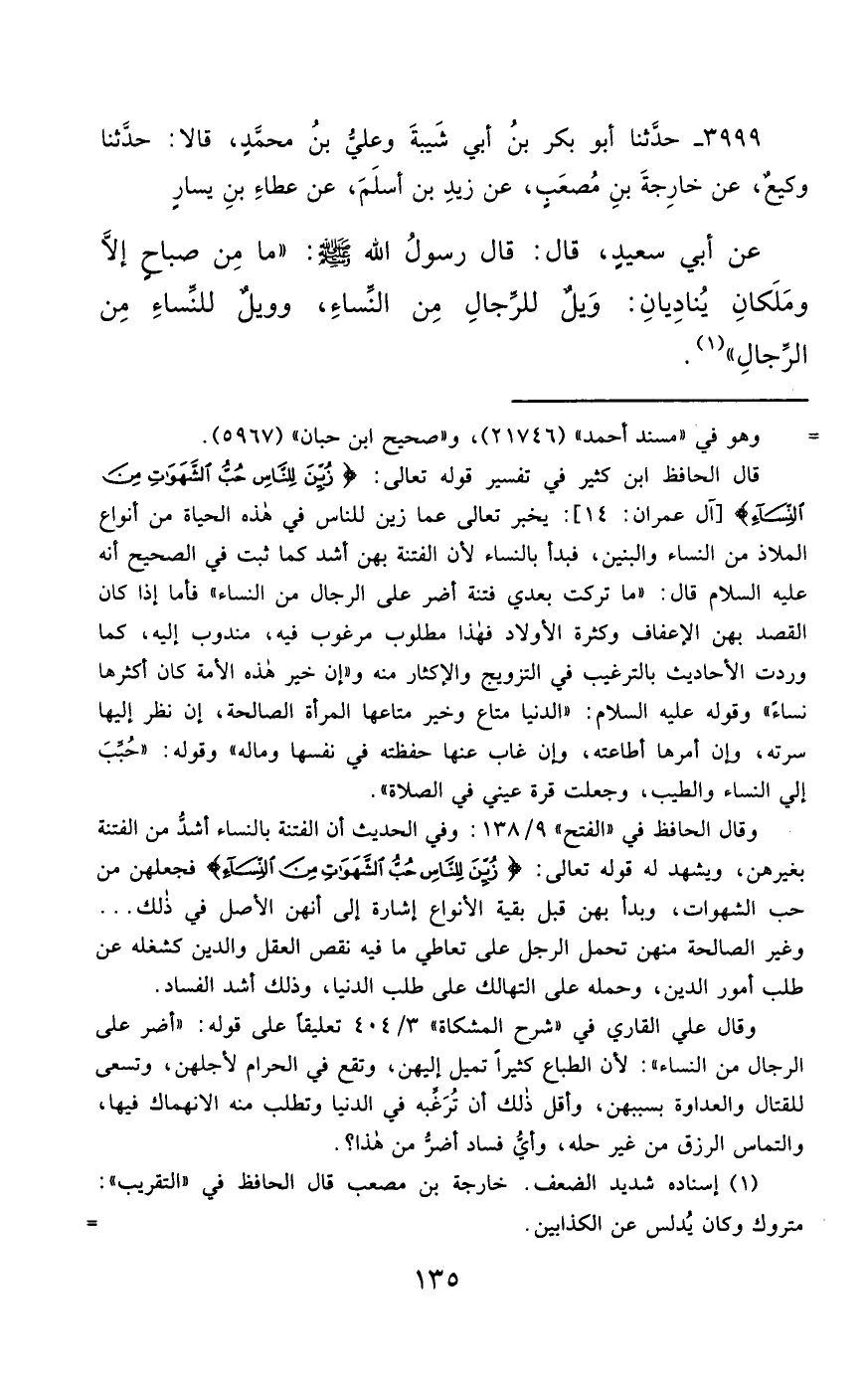 3999- حَدَّثَنَا أَبُو بَكْرِ بْنُ أَبِي شَيْبَةَ ، وَعَلِيُّ بْنُ مُحَمَّدٍ ، قَالاَ : حَدَّثَنَا وَكِيعٌ ، عَنْ خَارِجَةَ بْنِ مُصْعَبٍ ، عَنْ زَيْدِ بْنِ أَسْلَمَ ، عَنْ عَطَاءِ بْنِ يَسَارٍ ، عَنْ أَبِي سَعِيدٍ ، قَالَ : قَالَ رَسُولُ اللهِ صَلَّى الله عَليْهِ وسَلَّمَ : مَا مِنْ صَبَاحٍ إِلاَّ وَمَلَكَانِ يُنَادِيَانِ : وَيْلٌ لِلرِّجَالِ مِنَ النِّسَاءِ ، وَوَيْلٌ لِلنِّسَاءِ مِنَ الرِّجَالِ.