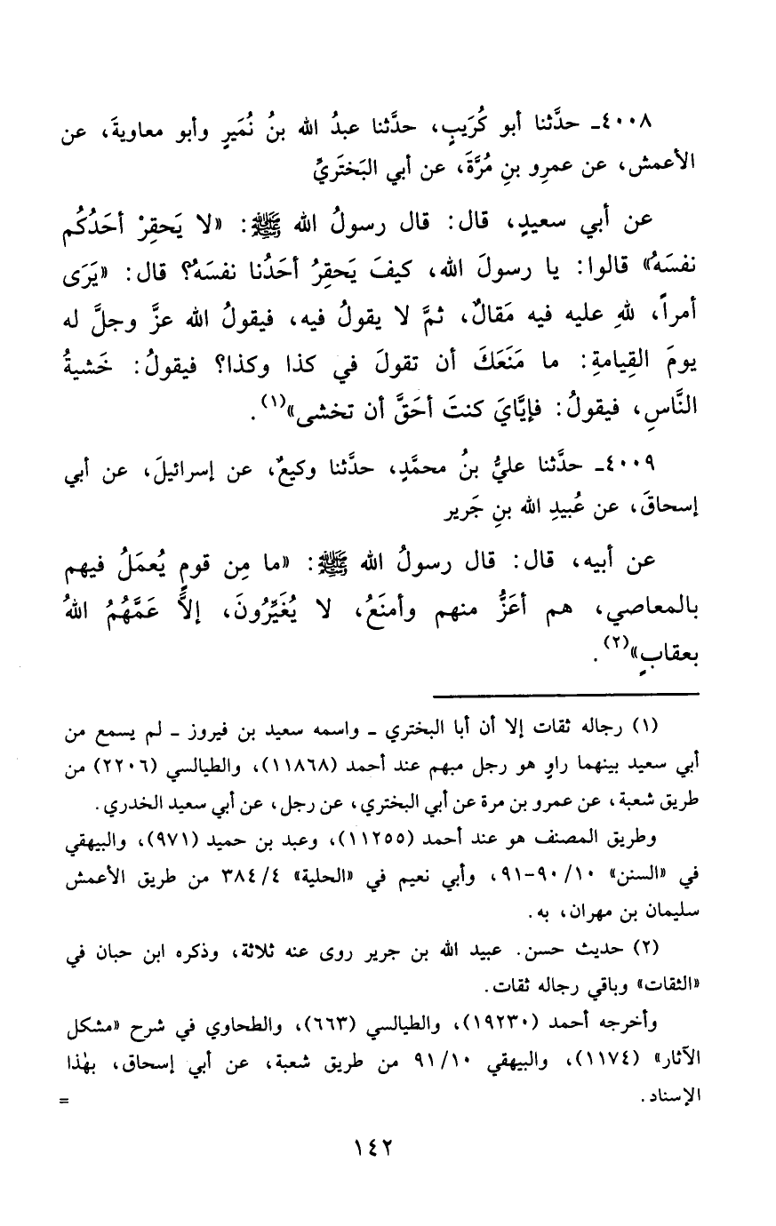 4008- حَدَّثَنَا أَبُو كُرَيْبٍ ، حَدَّثَنَا عَبْدُ اللهِ بْنُ نُمَيْرٍ ، وَأَبُو مُعَاوِيَةَ ، عَنِ الأَعْمَشِ ، عَنْ عَمْرِو بْنِ مُرَّةَ ، عَنْ أَبِي الْبَخْتَرِيِّ ، عَنْ أَبِي سَعِيدٍ ، قَالَ : قَالَ رَسُولُ اللهِ صَلَّى الله عَليْهِ وسَلَّمَ : لاَ يَحْقِرْ أَحَدُكُمْ نَفْسَهُ ، قَالُوا : يَا رَسُولَ اللهِ ، كَيْفَ يَحْقِرُ أَحَدُنَا نَفْسَهُ ؟ قَالَ : يَرَى أَمْرًا لِلَّهِ عَلَيْهِ فِيهِ مَقَالٌ ، ثُمَّ لاَ يَقُولُ فِيهِ ، فَيَقُولُ اللَّهُ عَزَّ وَجَلَّ لَهُ يَوْمَ الْقِيَامَةِ : مَا مَنَعَكَ أَنْ تَقُولَ فِي كَذَا وَكَذَا ؟ فَيَقُولُ : خَشْيَةُ النَّاسِ ، فَيَقُولُ : فَإِيَّايَ كُنْتَ أَحَقَّ أَنْ تَخْشَى.