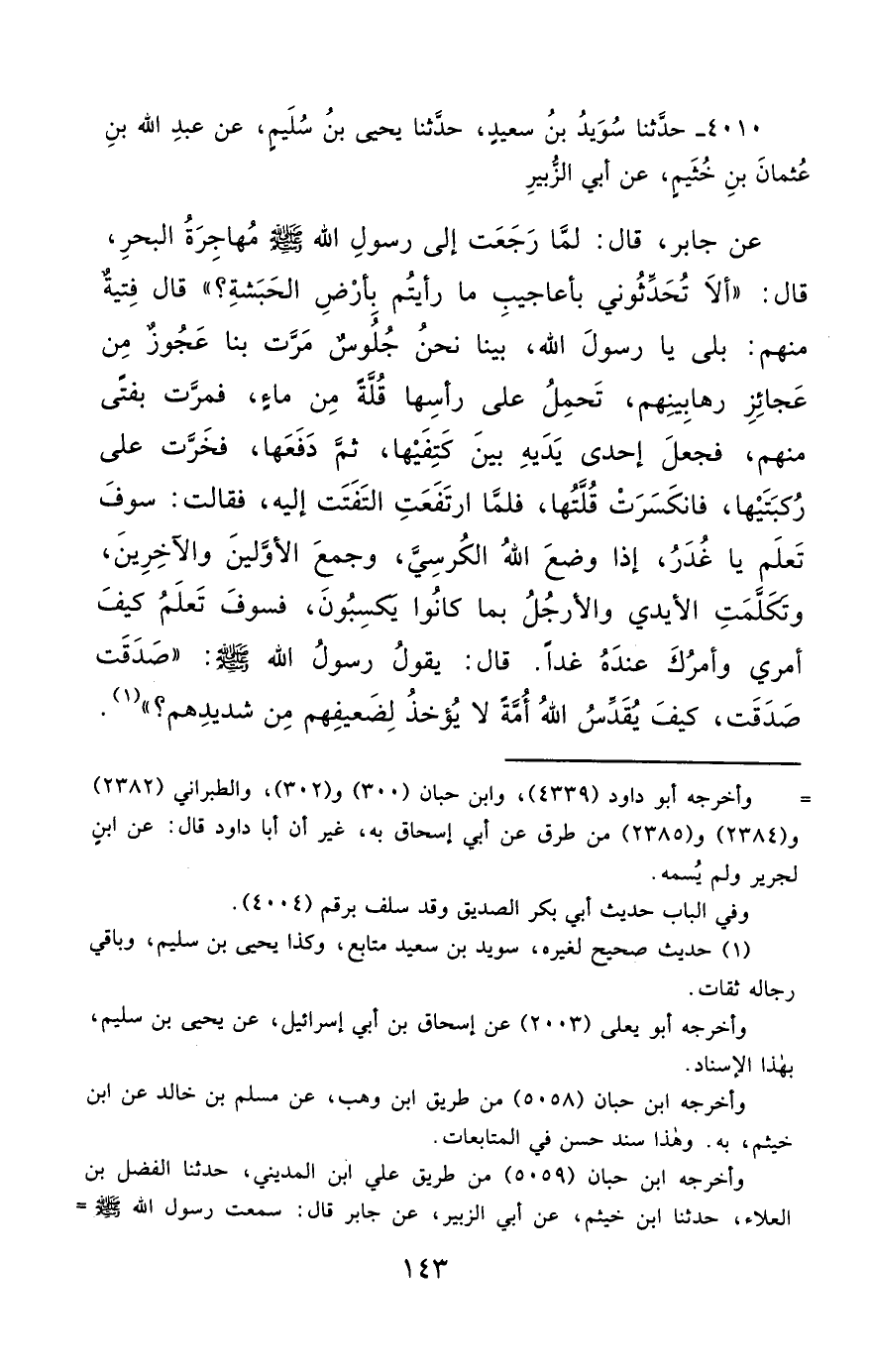 4010- حَدَّثَنَا سُوَيْدُ بْنُ سَعِيدٍ ، حَدَّثَنَا يَحْيَى بْنُ سُلَيْمٍ ، عَنْ عَبْدِ اللهِ بْنِ عُثْمَانَ بْنِ خُثَيْمٍ ، عَنْ أَبِي الزُّبَيْرِ ، عَنْ جَابِرٍ ، قَالَ : لَمَّا رَجَعَتْ إِلَى رَسُولِ اللهِ صَلَّى الله عَليْهِ وسَلَّمَ مُهَاجِرَةُ الْبَحْرِ ، قَالَ : أَلاَ تُحَدِّثُونِي بِأَعَاجِيبِ مَا رَأَيْتُمْ بِأَرْضِ الْحَبَشَةِ ؟ قَالَ فِتْيَةٌ مِنْهُمْ : بَلَى ، يَا رَسُولَ اللهِ ، بَيْنَا نَحْنُ جُلُوسٌ مَرَّتْ بِنَا عَجُوزٌ مِنْ عَجَائِزِ رَهَابِينِهِمْ ، تَحْمِلُ عَلَى رَأْسِهَا قُلَّةً مِنْ مَاءٍ ، فَمَرَّتْ بِفَتًى مِنْهُمْ ، فَجَعَلَ إِحْدَى يَدَيْهِ بَيْنَ كَتِفَيْهَا ، ثُمَّ دَفَعَهَا فَخَرَّتْ عَلَى رُكْبَتَيْهَا ، فَانْكَسَرَتْ قُلَّتُهَا ، فَلَمَّا ارْتَفَعَتِ الْتَفَتَتْ إِلَيْهِ ، فَقَالَتْ : سَوْفَ تَعْلَمُ يَا غُدَرُ إِذَا وَضَعَ اللَّهُ الْكُرْسِيَّ ، وَجَمَعَ الأَوَّلِينَ وَالآخِرِينَ ، وَتَكَلَّمَتِ الأَيْدِي وَالأَرْجُلُ ، بِمَا كَانُوا يَكْسِبُونَ ، فَسَوْفَ تَعْلَمُ كَيْفَ أَمْرِي وَأَمْرُكَ عِنْدَهُ غَدًا.