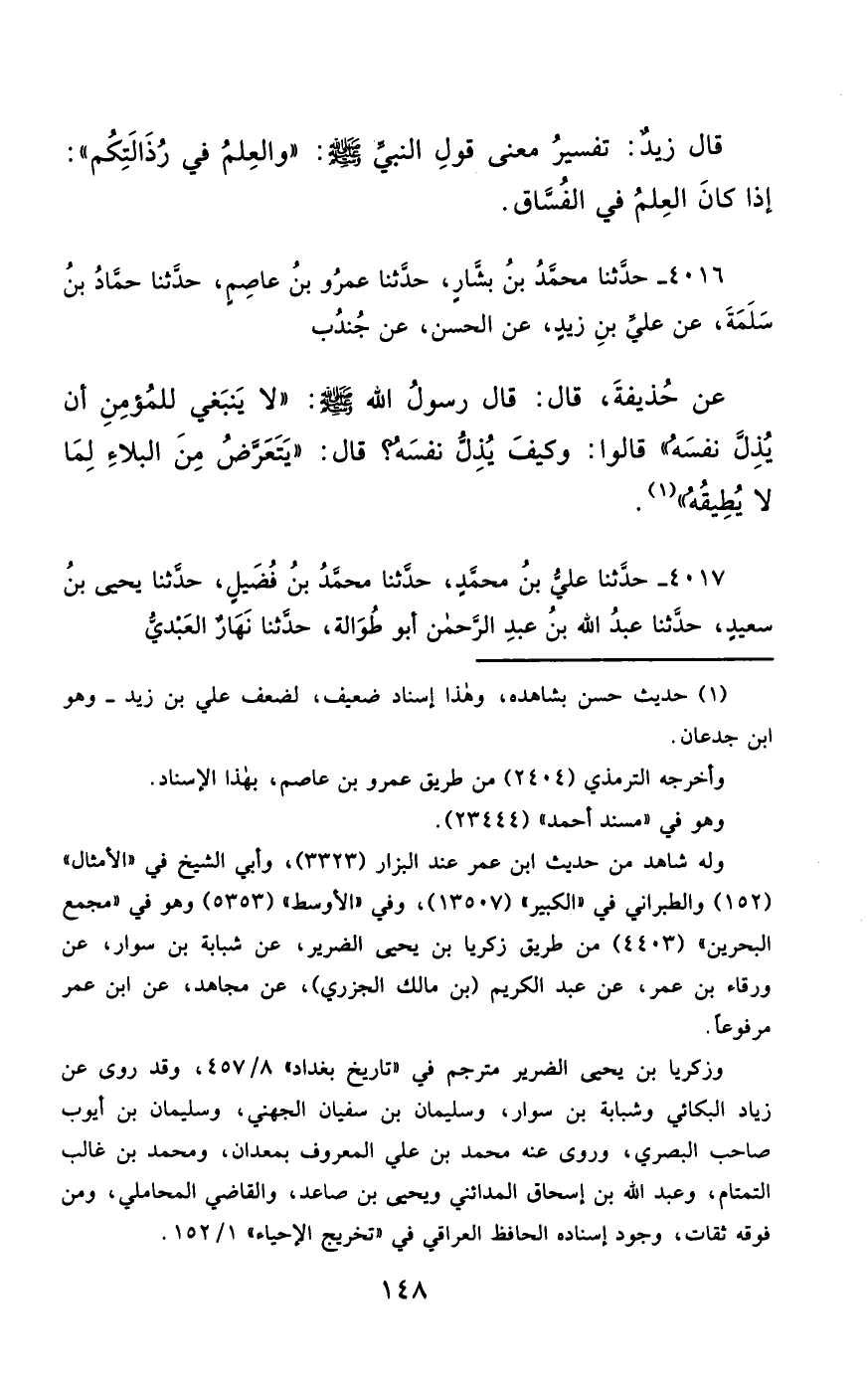 4016- حَدَّثَنَا مُحَمَّدُ بْنُ بَشَّارٍ ، حَدَّثَنَا عَمْرُو بْنُ عَاصِمٍ ، حَدَّثَنَا حَمَّادُ بْنُ سَلَمَةَ ، عَنْ عَلِيِّ بْنِ زَيْدٍ ، عَنِ الْحَسَنِ ، عَنْ جُنْدُبٍ ، عَنْ حُذَيْفَةَ ، قَالَ : قَالَ رَسُولُ اللهِ صَلَّى الله عَليْهِ وسَلَّمَ : لاَ يَنْبَغِي لِلْمُؤْمِنِ أَنْ يُذِلَّ نَفْسَهُ ، قَالُوا : وَكَيْفَ يُذِلُّ نَفْسَهُ ؟ قَالَ : يَتَعَرَّضُ مِنَ الْبَلاَءِ لِمَا لاَ يُطِيقُهُ.