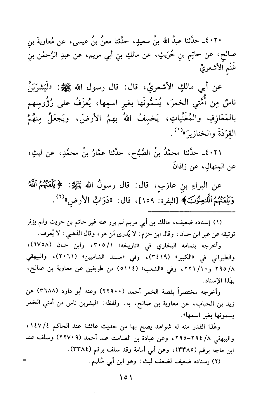 4020- حَدَّثَنَا عَبْدُ اللهِ بْنُ سَعِيدٍ ، حَدَّثَنَا مَعْنُ بْنُ عِيسَى ، عَنْ مُعَاوِيَةَ بْنِ صَالِحٍ ، عَنْ حَاتِمِ بْنِ حُرَيْثٍ ، عَنْ مَالِكِ بْنِ أَبِي مَرْيَمَ ، عَنْ عَبْدِ الرَّحْمَنِ بْنِ غَنْمٍ الأَشْعَرِيِّ ، عَنْ أَبِي مَالِكٍ الأَشْعَرِيِّ ، قَالَ : قَالَ رَسُولُ اللهِ صَلَّى الله عَليْهِ وسَلَّمَ : لَيَشْرَبَنَّ نَاسٌ مِنْ أُمَّتِي الْخَمْرَ ، يُسَمُّونَهَا بِغَيْرِ اسْمِهَا ، يُعْزَفُ عَلَى رُؤُوسِهِمْ بِالْمَعَازِفِ ، وَالْمُغَنِّيَاتِ ، يَخْسِفُ اللَّهُ بِهِمُ الأَرْضَ ، وَيَجْعَلُ مِنْهُمُ الْقِرَدَةَ وَالْخَنَازِيرَ.