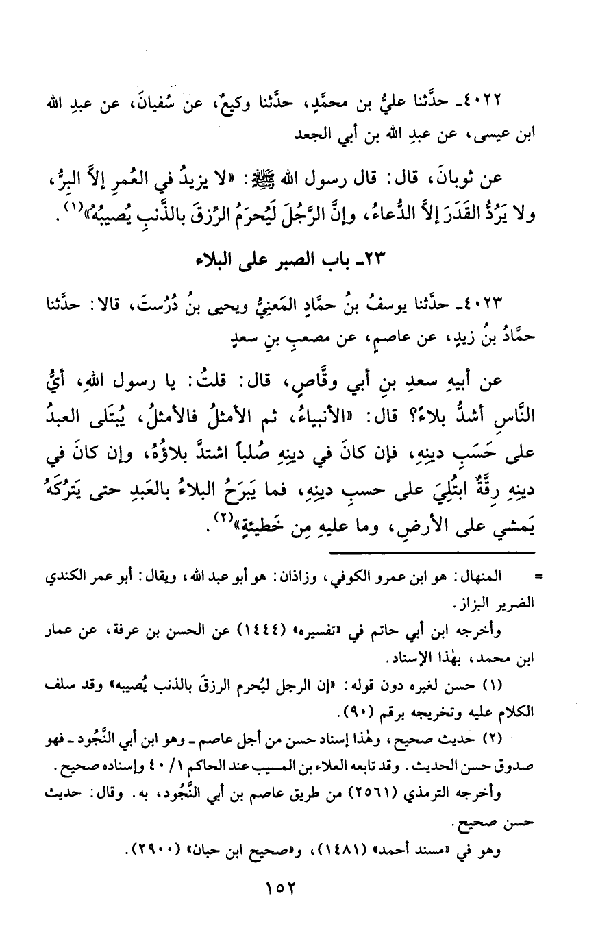 4023- حَدَّثَنَا يُوسُفُ بْنُ حَمَّادٍ الْمَعْنِيُّ ، وَيَحْيَى بْنُ دُرُسْتَ ، قَالاَ : حَدَّثَنَا حَمَّادُ بْنُ زَيْدٍ ، عَنْ عَاصِمٍ ، عَنْ مُصْعَبِ بْنِ سَعْدٍ ، عَنْ أَبِيهِ ، سَعْدِ بْنِ أَبِي وَقَّاصٍ ، قَالَ : قُلْتُ : يَا رَسُولَ اللهِ ، أَيُّ النَّاسِ أَشَدُّ بَلاَءً ؟ قَالَ : الأَنْبِيَاءُ ، ثُمَّ الأَمْثَلُ فَالأَمْثَلُ ، يُبْتَلَى الْعَبْدُ عَلَى حَسَبِ دِينِهِ ، فَإِنْ كَانَ فِي دِينِهِ صُلْبًا ، اشْتَدَّ بَلاَؤُهُ ، وَإِنْ كَانَ فِي دِينِهِ رِقَّةٌ ، ابْتُلِيَ عَلَى حَسَبِ دِينِهِ ، فَمَا يَبْرَحُ الْبَلاَءُ بِالْعَبْدِ ، حَتَّى يَتْرُكَهُ يَمْشِي عَلَى الأَرْضِ ، وَمَا عَلَيْهِ مِنْ خَطِيئَةٍ.