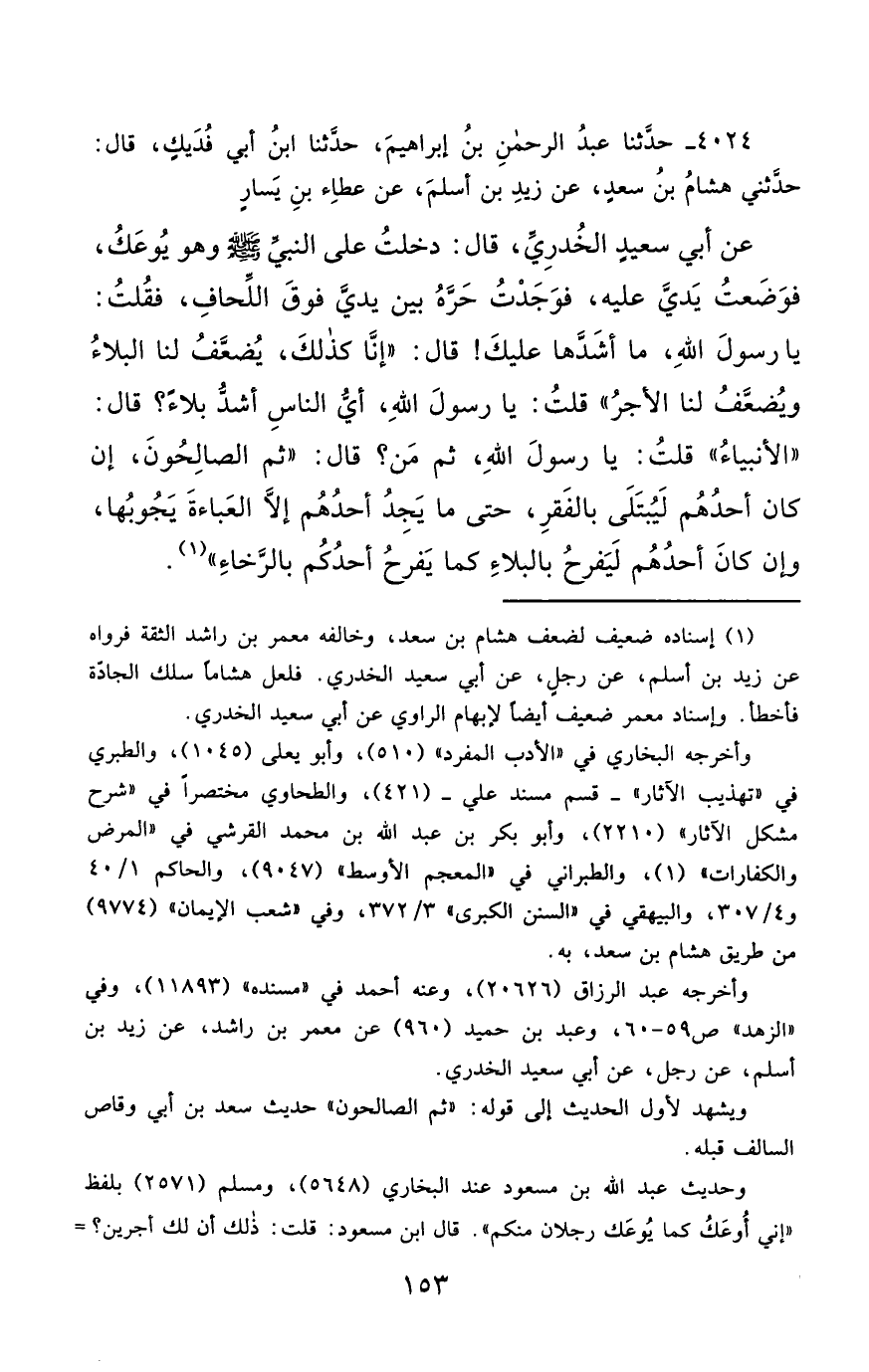 4024- حَدَّثَنَا عَبْدُ الرَّحْمَنِ بْنُ إِبْرَاهِيمَ ، حَدَّثَنَا ابْنُ أَبِي فُدَيْكٍ , حَدَّثَنِي هِشَامُ بْنُ سَعْدٍ ، عَنْ زَيْدِ بْنِ أَسْلَمَ ، عَنْ عَطَاءِ بْنِ يَسَارٍ ، عَنْ أَبِي سَعِيدٍ الْخُدْرِيِّ ، قَالَ : دَخَلْتُ عَلَى النَّبِيِّ صَلَّى الله عَليْهِ وسَلَّمَ وَهُوَ يُوعَكُ ، فَوَضَعْتُ يَدِي عَلَيْهِ فَوَجَدْتُ حَرَّهُ بَيْنَ يَدَيَّ فَوْقَ اللِّحَافِ ، فَقُلْتُ : يَا رَسُولَ اللهِ ، مَا أَشَدَّهَا عَلَيْكَ قَالَ : إِنَّا كَذَلِكَ يُضَعَّفُ لَنَا الْبَلاَءُ ، وَيُضَعَّفُ لَنَا الأَجْرُ قُلْتُ : يَا رَسُولَ اللهِ ، أَيُّ النَّاسِ أَشَدُّ بَلاَءً ؟ قَالَ : الأَنْبِيَاءُ ، قُلْتُ : يَا رَسُولَ اللهِ ، ثُمَّ مَنْ ؟ قَالَ : ثُمَّ الصَّالِحُونَ ، إِنْ كَانَ أَحَدُهُمْ لَيُبْتَلَى بِالْفَقْرِ ، حَتَّى مَا يَجِدُ أَحَدُهُمْ إِلاَّ الْعَبَاءَةَ يَحُوبُهَا ، وَإِنْ كَانَ أَحَدُهُمْ لَيَفْرَحُ بِالْبَلاَءِ ، كَمَا يَفْرَحُ أَحَدُكُمْ بِالرَّخَاءِ.