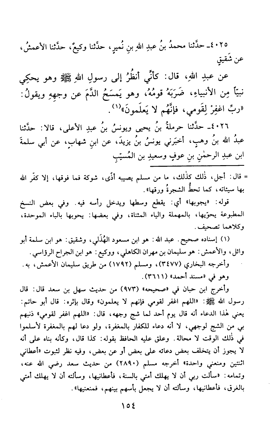 4025- حَدَّثَنَا مُحَمَّدُ بْنُ عَبْدِ اللهِ بْنِ نُمَيْرٍ ، حَدَّثَنَا وَكِيعٌ ، حَدَّثَنَا الأَعْمَشُ ، عَنْ شَقِيقٍ ، عَنْ عَبْدِ اللهِ ، قَالَ : كَأَنِّي أَنْظُرُ إِلَى رَسُولِ اللهِ صَلَّى الله عَليْهِ وسَلَّمَ ، وَهُوَ يَحْكِي نَبِيًّا مِنَ الأَنْبِيَاءِ ، ضَرَبَهُ قَوْمُهُ ، وَهُوَ يَمْسَحُ الدَّمَ عَنْ وَجْهِهِ ، وَيَقُولُ : رَبِّ اغْفِرْ لِقَوْمِي فَإِنَّهُمْ لاَ يَعْلَمُونَ.