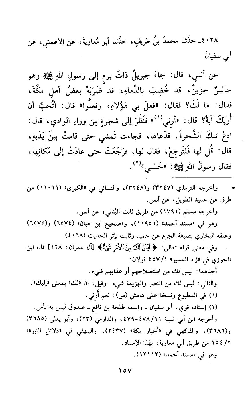 4028- حَدَّثَنَا مُحَمَّدُ بْنُ طَرِيفٍ ، حَدَّثَنَا أَبُو مُعَاوِيَةَ ، عَنِ الأَعْمَشِ ، عَنْ أَبِي سُفْيَانَ ، عَنْ أَنَسٍ ، قَالَ : جَاءَ جِبْرِيلُ عَلَيْهِ السَّلاَمُ ذَاتَ يَوْمٍ إِلَى رَسُولِ اللهِ صَلَّى الله عَليْهِ وسَلَّمَ ، وَهُوَ جَالِسٌ حَزِينٌ قَدْ خُضِّبَ بِالدِّمَاءِ ، قَدْ ضَرَبَهُ بَعْضُ أَهْلِ مَكَّةَ ، فَقَالَ : مَا لَكَ ؟ فَقَالَ : فَعَلَ بِي هَؤُلاَءِ ، وَفَعَلُوا ، قَالَ : أَتُحِبُّ أَنْ أُرِيَكَ آيَةً ؟ قَالَ : نَعَمْ ، أَرِنِي فَنَظَرَ إِلَى شَجَرَةٍ مِنْ وَرَاءِ الْوَادِي ، قَالَ : ادْعُ تِلْكَ الشَّجَرَةَ ، فَدَعَاهَا فَجَاءَتْ تَمْشِي ، حَتَّى قَامَتْ بَيْنَ يَدَيْهِ ، قَالَ : قُلْ لَهَا فَلْتَرْجِعْ ، فَقَالَ لَهَا ، فَرَجَعَتْ حَتَّى عَادَتْ إِلَى مَكَانِهَا ، فَقَالَ رَسُولُ اللهِ صَلَّى الله عَليْهِ وسَلَّمَ : حَسْبِي.