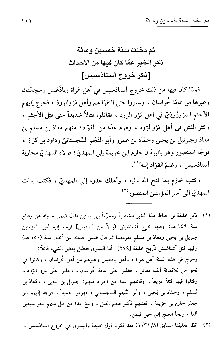 (١) ذكر خليفة بن خياط هذا الخبر مختصرًا ومجزّءًا بين سنتين فقال ضمن حديثه عن وقائع سنة ١٤٩ هـ: وفيها خرج أشناشيش (بدلًا من أشاذيس] فوجّه إليه أمير المؤمنين جبريل بن يحيى ومعاذ بن مسلم فهزمهما ثم قال ضمن حديثه عن أخبار سنة (١٥٠ هـ) وفيها قتل أشناشيش تأريخ خليفة [٢٧٩]. أما البسوي ففصَّل بعض الشيء قائلًا: