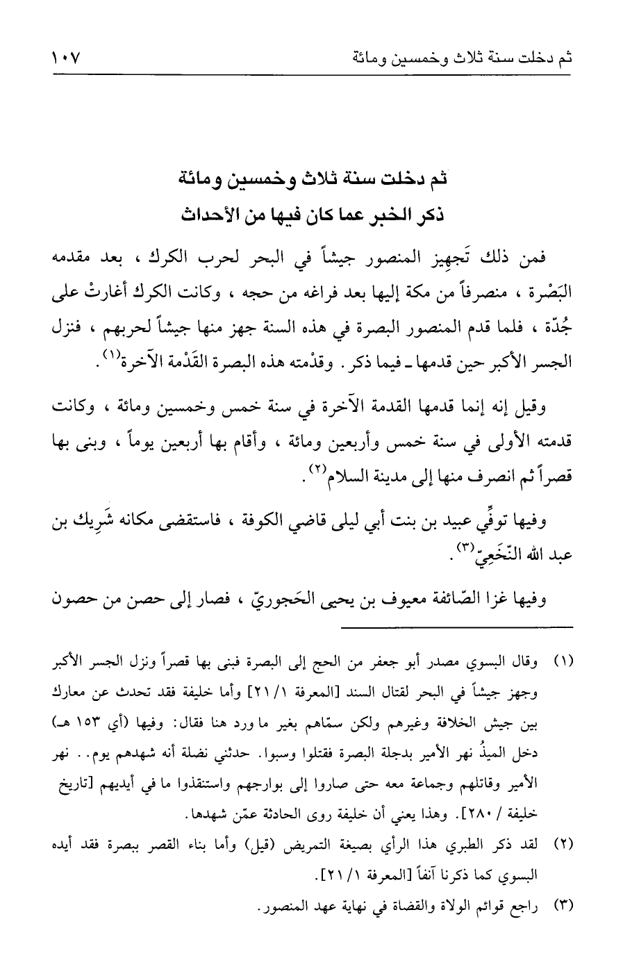 (١) وقال البسوي مصدر أبو جعفر من الحج إلى البصرة فبنى بها قصرًا ونزل الجسر الأكبر وجهز جيشًا في البحر لقتال السند [المعرفة ١/ ٢١] وأما خليفة فقد تحدث عن معارك بين جيش الخلافة وغيرهم ولكن سمّاهم بغير ما ورد هنا فقال: وفيها (أي ١٥٣ هـ) دخل الميذُ نهر الأمير بدجلة البصرة فقتلوا وسبوا. حدثني نضلة أنه شهدهم يوم .. نهر الأمير وقاتلهم وجماعة معه حتى صاروا إلى بوارجهم واستنقذوا ما في أيديهم [تاريخ خليفة / ٢٨٠]. وهذا يعني أن خليفة روكما الحادثة عمّن شهدها.