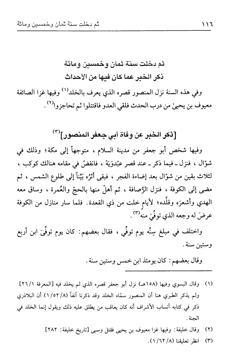 (١) وقال البسوي وفيها (١٥٨ هـ) نزل أبو جعفر قصره الذي لم يخلد فيه [المعرفة ١/ ٢٦] ولم يذكر الطبري هنا أن المنصور سمّاه الخلد وقد ذكرنا آنفًا (٨/ ٥٢ / ١) أن البلاذري ذكر في كتابه أنساب الأشراف أنه كان يعاقب من يطلق عليه ذلك ويقول إنما الخلد في الجنة.