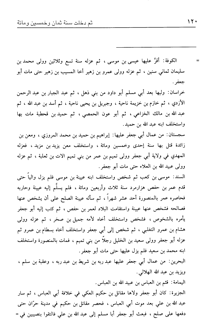 خراسان: وليها بعد أبي مسلم أبو داود من بني ذهل، ثم عبد الجبار بن عبد الرحمن الأزدي، ثم خازم بن خزيمة ناحية، وجبريل بن يحيى ناحية، ثم أسد بن عبد الله، ثم عبد الله بن مالك الخزاعي، ثم أبو عون الحمصي، ثم حميدبن قحطبة مات بها واستخلف ابنه عبد الله بن حميد.