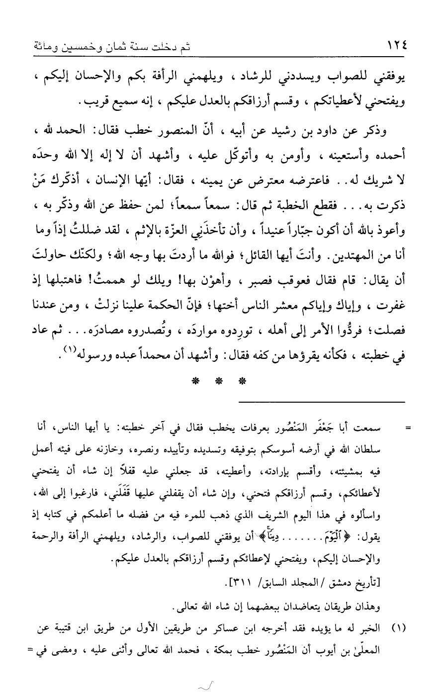 (١) الخبر له ما يؤيده فقد أخرجه ابن عساكر من طريقين الأول من طريق ابن قتيبة عن المعلّى بن أيوب أن المَنْصُور خطب بمكة، فحمد الله تعالى وأثنى عليه، ومضى في =