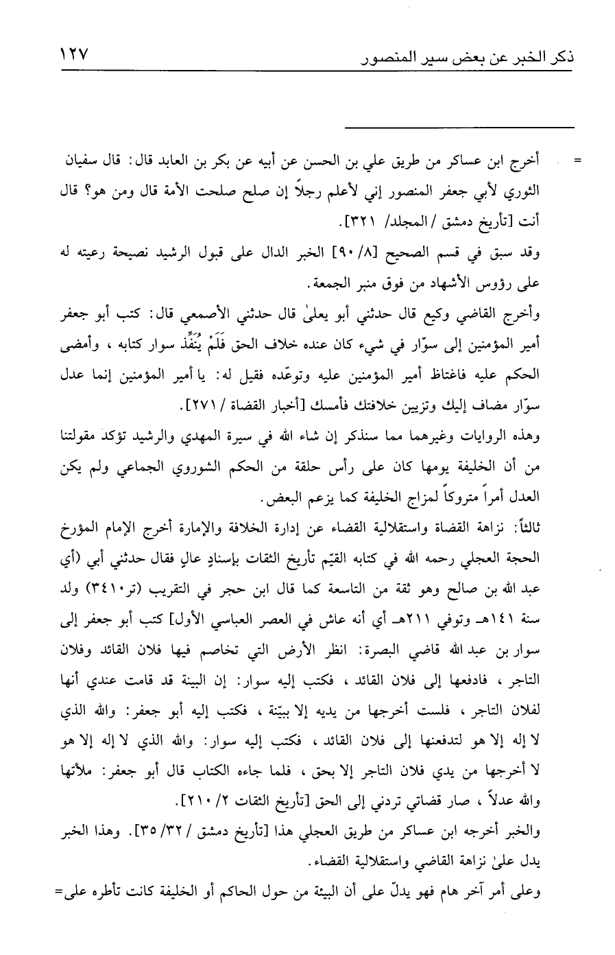 والخبر أخرجه ابن عساكر من طريق العجلي هذا [تأريخ دمشق / ٣٢/ ٣٥]. وهذا الخبر يدل على نزاهة القاضي واستقلالية القضاء.