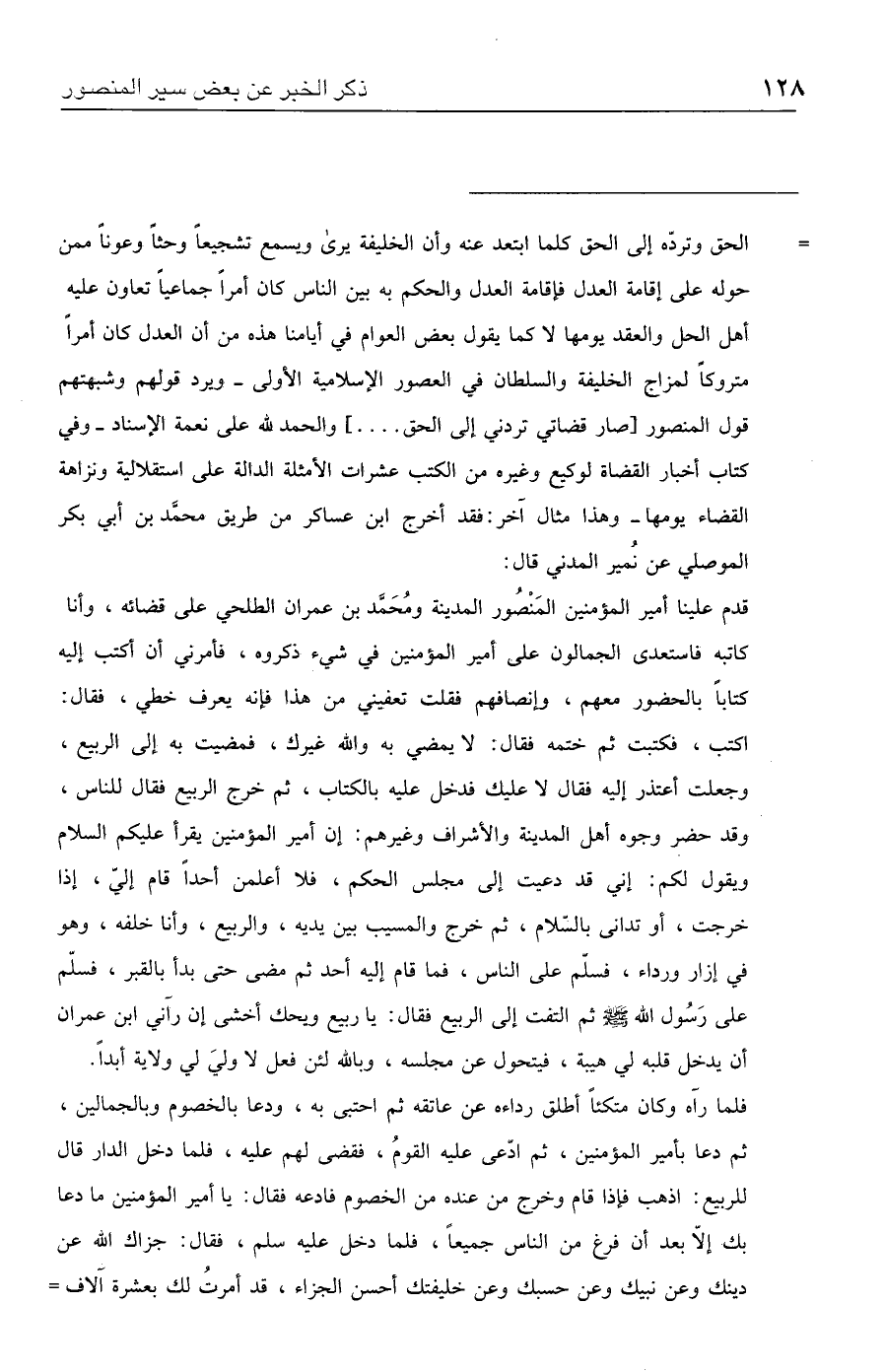 = الحق وتردّه إلى الحق كلما ابتعد عنه وأن الخليفة يرى ويسمع تشجيعًا وحثًا وعونًا ممن حوله على إقامة العدل فإقامة العدل والحكم به بين الناس كان أمرًا جماعيًا تعاون عليه أهل الحل والعقد يومها لا كما يقول بعض العوام في أيامنا هذه من أن العدل كان أمرًا متروكًا لمزاج الخليفة والسلطان في العصور الإسلامية الأولى - ويرد قولهم وشبهتهم قول المنصور [صار قضاتي تردني إلى الحق .... ] والحمد لله على نعمة الإسناد - وفي كتاب أخبار القضاة لوكيع وغيره من الكتب عشرات الأمثلة الدالة على استقلالية ونزاهة القضاء يومها - وهذا مثال آخر: فقد أخرج ابن عساكر من طريق محمَّد بن أبي بكر الموصلي عن نُمير المدني قال: