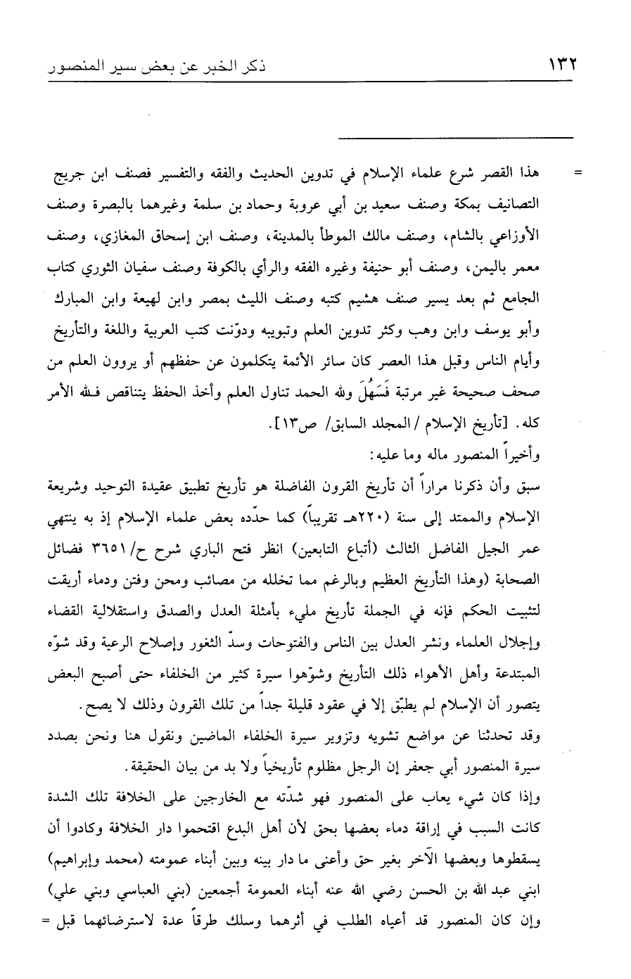 = هذا القصر شرع علماء الإسلام في تدوين الحديث والفقه والتفسير فصنف ابن جريج التصانيف - بمكة وصنف سعيد بن أبي عروبة وحماد بن سلمة وغيرهما بالبصرة وصنف الأوزاعي بالشام، وصنف مالك الموطأ بالمدينة، وصنف ابن إسحاق المغازي، وصنف معمر باليمن، وصنف أبو حنيفة وغيره الفقه والرأي بالكوفة وصنف سفيان الثوري كتاب الجامع ثم بعد يسير صنف هشيم كتبه وصنف الليث بمصر وابن لهيعة وابن المبارك وأبو يوسف وابن وهب وكثر تدوين العلم وتبويبه ودوّنت كتب العربية واللغة والتأريخ وأيام الناس وقبل هذا العصر كان سائر الأئمة يتكلمون عن حفظهم أو يروون العلم من صحف صحيحة غير مرتبة فَسَهُلَ ولله الحمد تناول العلم وأخذ الحفظ يتناقص فلله الأمر كله. [تأريخ الإسلام / المجلد السابق / ص ١٣].