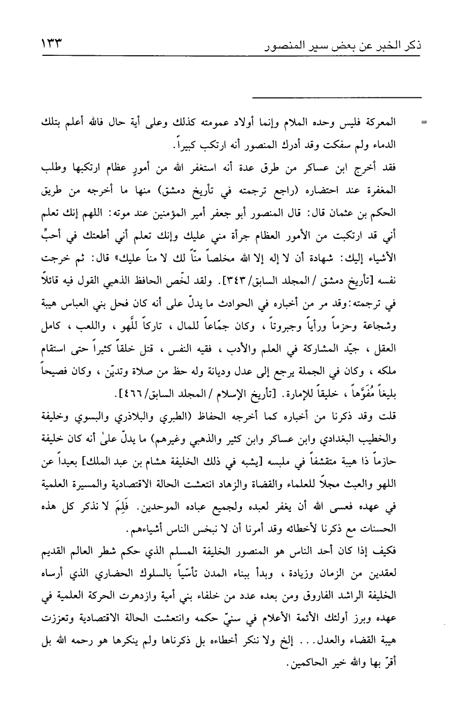 فكيف إذا كان أحد الناس هو المنصور الخليفة المسلم الذي حكم شطر العالم القديم لعقدين من الزمان وزيادة، وبدأ ببناء المدن تأسّيًا بالسلوك الحضاري الذي أرساه الخليفة الراشد الفاروق ومن بعده عدد من خلفاء بني أمية وازدهرت الحركة العلمية في عهده وبرز أولئك الأئمة الأعلام في سنيّ حكمه وانتعشت الحالة الاقتصادية وتعززت هيبة القضاء والعدل ... إلخ ولا ننكر أخطاءه بل ذكرناها ولم ينكرها هو رحمه الله بل أقرّ بها والله خير الحاكمين.