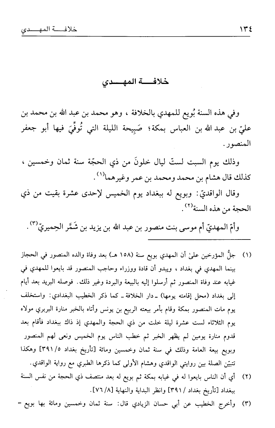 (١) جلُّ المؤرخين على أن المهدي بويع سنة (١٥٨ هـ) بعد وفاة والده المنصور في الحجاز بينما المهدي في بغداد، ويبدو أن قادة ووزراء وحاجب المنصور قد بايعوا للمهدي في غيابه عند وفاة المنصور ثم أرسلوا إليه بالبيعة والبردة وغير ذلك. فوصله البريد بعد أيام إلى بغداد (محل إقامته يومها) - دار الخلافة - كما ذكر الخطيب البغدادي: واستخلف يوم مات المنصور بمكة وقام بأمر بيعته الربيع بن يونس وأتاه بالخبر منارة البربري مولاه يوم الثلاثاء لست عشرة ليلة خلت من ذي الحجة والمهدي إذ ذاك ببغداد فأقام بعد قدوم منارة يومين لم يظهر الخبر ثم خطب الناس يوم الخميس ونعى لهم المنصور وبويع بيعة العامة وذلك في سنة ثمان وخمسين ومائة [تأريخ بغداد ٥/ ٣٩١] وهكذا تتبيّن الصلة بين روايتي الواقدي وهشام الأولى كما ذكرها الطبري مع رواية الواقدي.