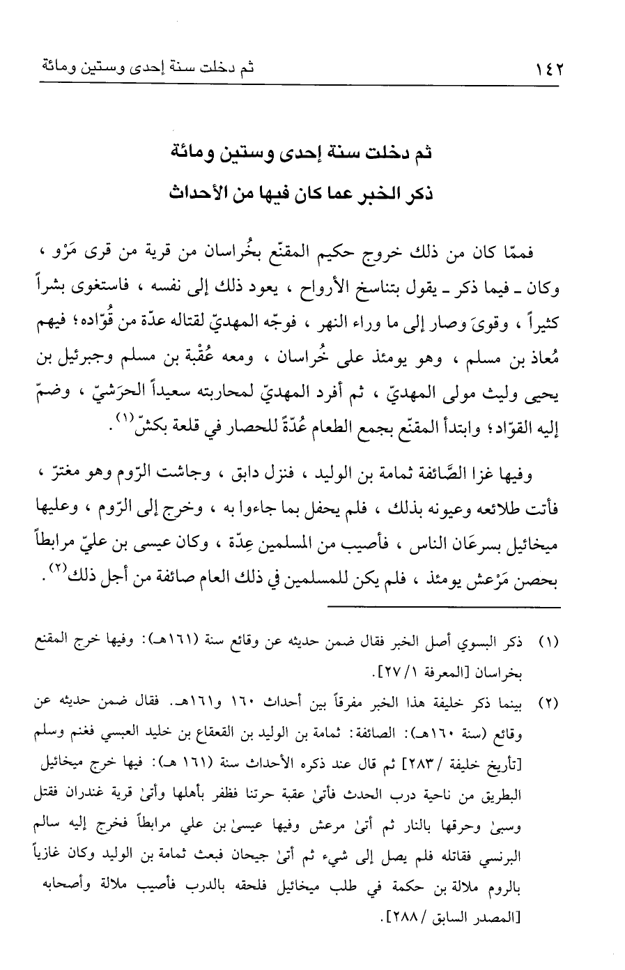 (٢) بينما ذكر خليفة هذا الخبر مفرقًا بين أحداث ١٦٠ و ١٦١ هـ. فقال ضمن حديثه عن وقائع (سنة ١٦٠ هـ): الصائفة: ثمامة بن الوليد بن القعقاع بن خليد العبسي فغنم وسلم [تأريخ خليفة / ٢٨٣] ثم قال عند ذكره الأحداث سنة (١٦١ هـ): فيها خرج ميخائيل البطريق من ناحية درب الحدث فأتى عقبة حرتنا فظفر بأهلها وأتى قرية غندران فقتل وسبى وحرقها بالنار ثم أتى مرعش وفيها عيسى بن علي مرابطًا فخرج إليه سالم البرنسي فقاتله فلم يصل إلى شيء ثم أتى جيحان فبعث ثمامة بن الوليد وكان غازيًا بالروم ملالة بن حكمة في طلب ميخائيل فلحقه بالدرب فأصيب ملالة وأصحابه [المصدر السابق / ٢٨٨].