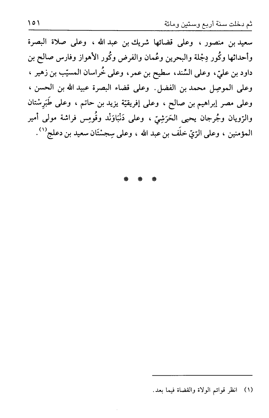 سعيد بن منصور، وعلى قضائها شريك بن عبد الله، وعلى صلاة البصرة وأحداثها وكُور دِجْلة والبحرين وعُمان والفرض وكُور الأهواز وفارس صالح بن داود بن عليّ، وعلى السِّند، سطيح بن عمر، وعلى خُراسان المسيّب بن زهير، وعلى الموصِل محمد بن الفضل. وعلى قضاء البصرة عبيد الله بن الحسن، وعلى مصر إبراهيم بن صالح، وعلى إفريقيّة يزيد بن حاتم، وعلى طَبَرِسْتان والرّويان وجُرجان يحيى الحَرَشِيّ، وعلى دَنْبَاوَنْد وقُومِس فراشة مولى أمير المؤمنين، وعلى الرّيّ خلَف بن عبد الله، وعلى سِجسْتَان سعيد بن دعلج (١).