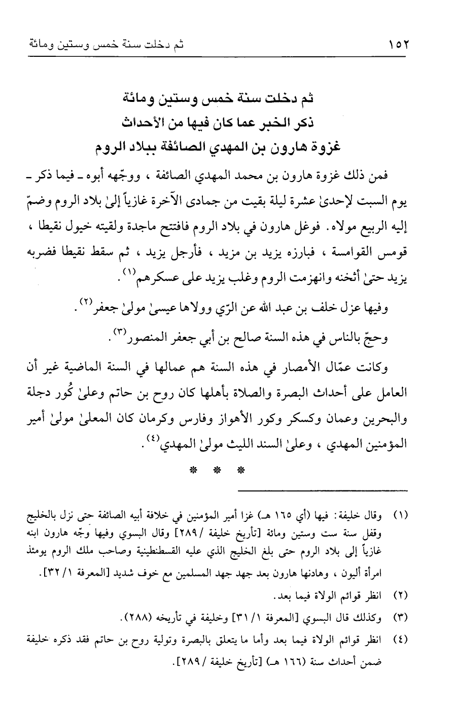 (١) وقال خليفة: فيها (أي ١٦٥ هـ) غزا أمير المؤمنين في خلافة أبيه الصائفة حتى نزل بالخليج وقفل سنة ست وستين ومائة [تأريخ خليفة / ٢٨٩] وقال البسوي وفيها وجّه هارون ابنه غازيًا إلى بلاد الروم حتى بلغ الخليج الذي عليه القسطنطينية وصاحب ملك الروم يومئذ امرأة أليون، وهادنها هارون بعد جهد جهد المسلمبن مع خوف شديد [المعرفة ١/ ٣٢].