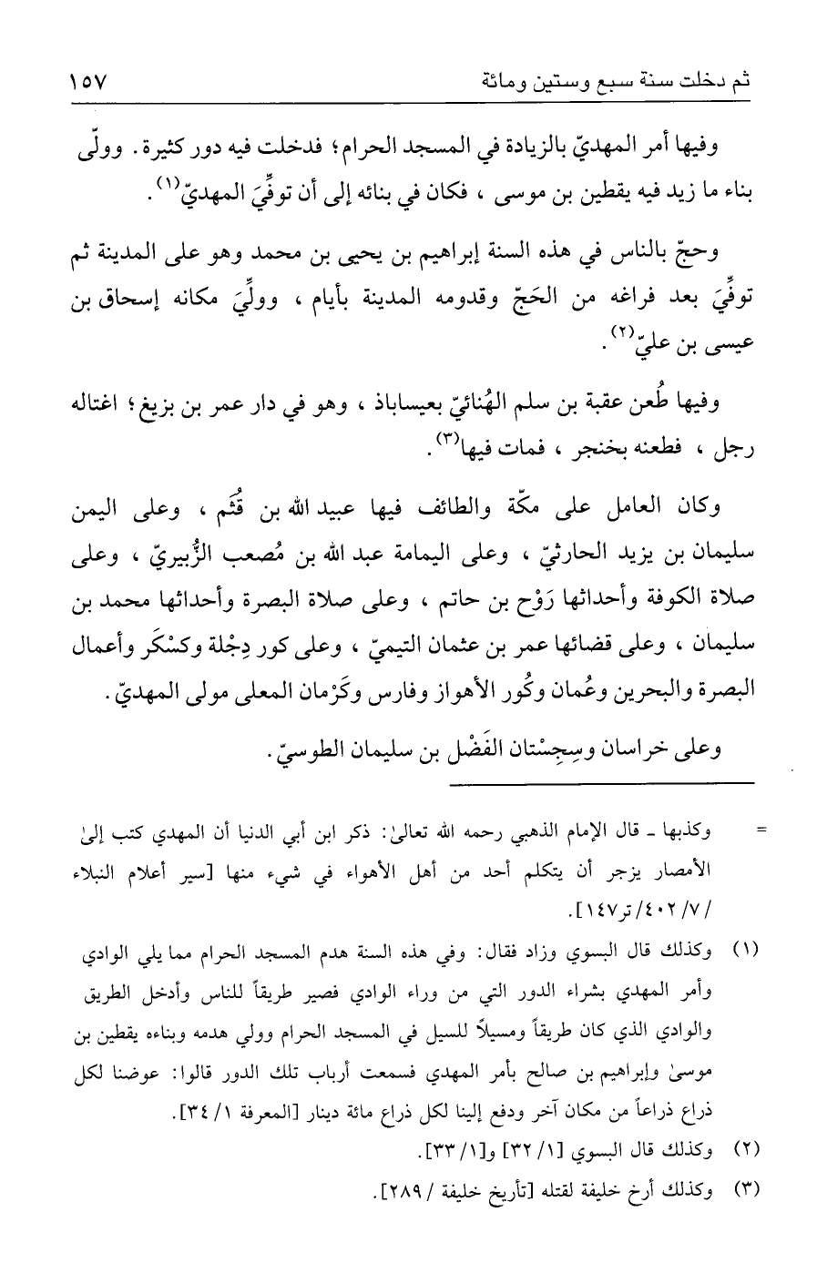 (١) وكذلك قال البسوي وزاد فقال: وفي هذه السنة هدم المسجد الحرام مما يلي الوادي وأمر المهدي بشراء الدور التي من وراء الوادي فصير طريقًا للناس وأدخل الطريق والوادي الذي كان طريقًا ومسيلًا للسيل في المسجد الحرام وولي هدمه وبناءه يقطين بن موسى وإبراهيم بن صالح بأمر المهدي فسمعت أرباب تلك الدور قالوا: عوضنا لكل ذراع ذراعًا من مكان آخر ودفع إلينا لكل ذراع مائة دينار [المعرفة ١/ ٣٤].