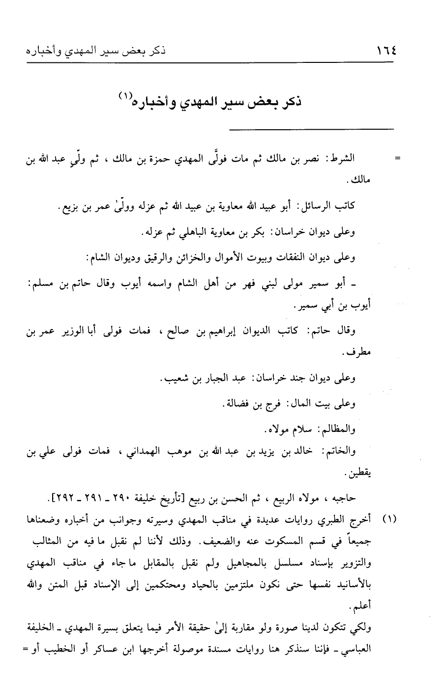 (١) أخرج الطبري روايات عديدة في مناقب المهدي وسيرته وجوانب من أخباره وضعناها جميعًا في قسم المسكوت عنه والضعيف. وذلك لأننا لم نقبل ما فيه من المثالب والتزوير بإسناد مسلسل بالمجاهيل ولم نقبل بالمقابل ما جاء في مناقب المهدي بالأسانيد نفسها حتى نكون ملتزمين بالحياد ومحتكمين إلى الإسناد قبل المتن والله أعلم.