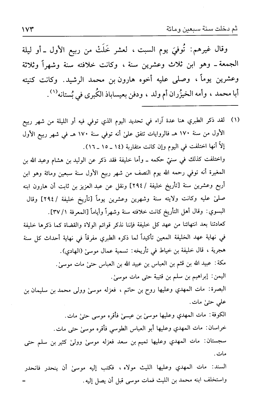 (١) لقد ذكر الطبري هنا عدة آراء في تحديد اليوم الذي توفي فيه أو الليلة من شهر ربيع الأول من سنة ١٧٠ هـ فالروايات تتفق على أنه توفي سنة ١٧٠ هـ في شهر ربيع الأول إلّا أنها اختلفت في اليوم وإن كانت متقاربة (١٤ - ١٥ - ١٦).