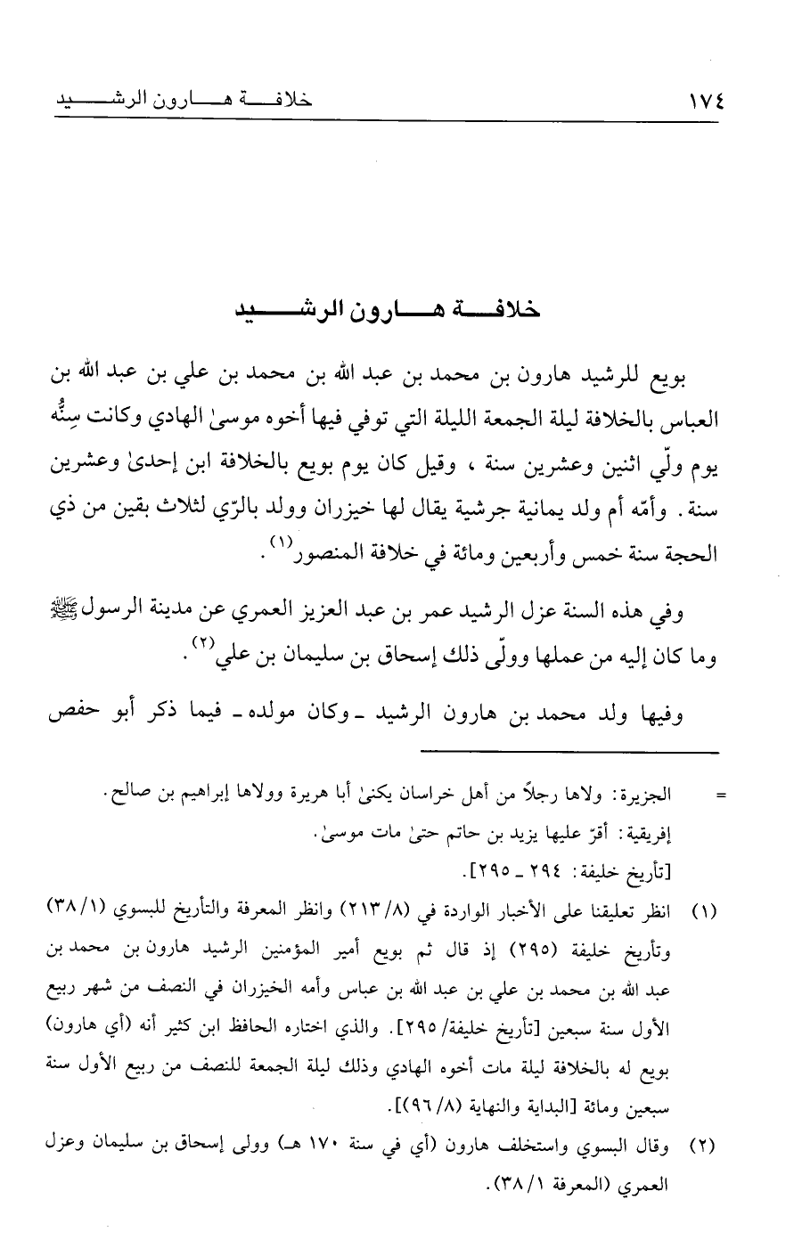 (١) انظر تعليقنا على الأخبار الواردة في (٨/ ٢١٣) وانظر المعرفة والتأريخ للبسوي (١/ ٣٨) وتأريخ خليفة (٢٩٥) إذ قال ثم بويع أمير المؤمنين الرشيد هارون بن محمد بن عبد الله بن محمد بن علي بن عبد الله بن عباس وأمه الخيزران في النصف من شهر ربيع الأول سنة سبعين [تأريخ خليفة / ٢٩٥]. والذي اختاره الحافظ ابن كثير أنه (أي هارون) بويع له بالخلافة ليلة مات أخوه الهادي وذلك ليلة الجمعة للنصف من ربيع الأول سنة سبعين ومائة [البداية والنهاية (٨/ ٩٦)].