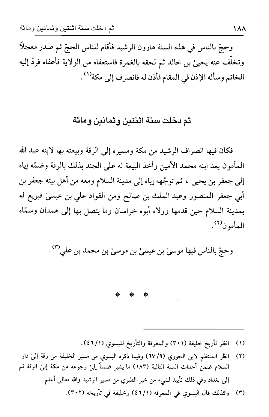(٢) انظر المنتظم لابن الجوزي (٩/ ٦٧) وفيما ذكره البسوي من مسير الخليفة من رقة إلى دار السلام ضمن أحداث السنة التالية (١٨٣) ما يشير ضمنًا إلى رجوعه من مكة إلى الرقة ثم إلى بغداد وفي ذلك تأييد لشيء من خبر الطبري من مسير الرشيد والله تعالى أعلم.