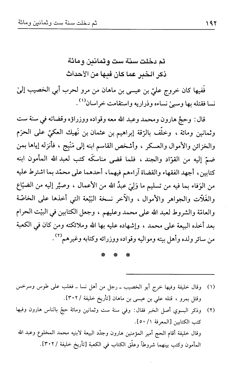 قال: وحجَّ هارون ومحمد وعبد الله معه وقواده ووزراؤه وقضاته في سنة ست وثمانين ومائة، وخلّف بالرّقة إبراهيم بن عثمان بن نَهيك العكيّ على الحرَم والخزائن والأموال والعسكر، وأشخص القاسم ابنه إلى مَنْبج، فأنزله إياها بمن ضمّ إليه من القوّاد والجند، فلما قضى مناسكَه كتب لعبد الله المأمون ابنه كتابين، أجهد الفقهاء والقضاة آراءهم فيهما، أحدهما على محمّد بما اشترط عليه من الوَفاء بما فيه من تسليم ما وَلِيَ عبدُ الله من الأعمال، وصيَّر إليه من الضيّاع والغَلّات والجواهر والأموال، والآخر نسخة البَيعة التي أخذها على الخاصّة والعامّة والشروط لعبد الله على محمد وعليهم، وجعل الكتابين في البيت الحرام بعد أخذه البيعة على محمد، وإشهاده عليه بها الله وملائكته ومن كان في الكعبة من سائر ولده وأهل بيته ومواليه وقواده ووزرائه وكتابه وغيرهم (٢).