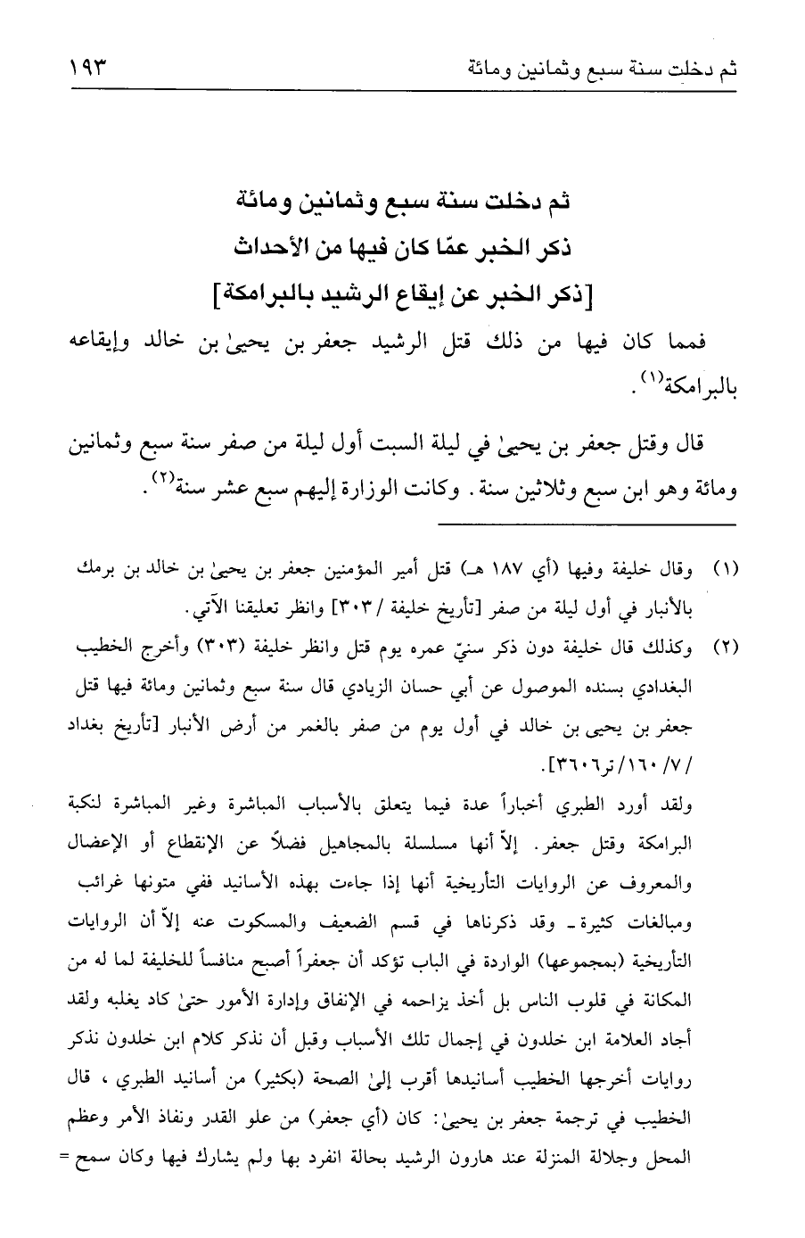 (١) وقال خليفة وفيها (أي ١٨٧ هـ) قتل أمير المؤمنين جعفر بن يحيى بن خالد بن برمك بالأنبار في أول ليلة من صفر [تأريخ خليفة / ٣٠٣] وانظر تعليقنا الآتي.