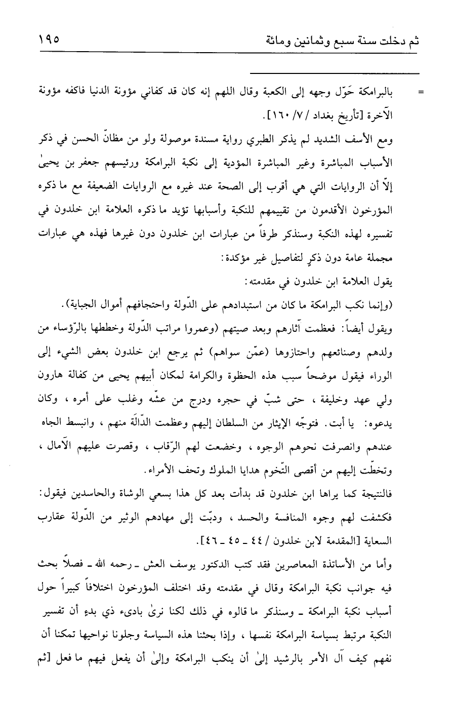 وأما من الأساتذة المعاصرين فقد كتب الدكتور يوسف العش -رحمه الله- فصلًا بحث فيه جوانب نكبة البرامكة وقال في مقدمته وقد اختلف المؤرخون اختلافًا كبيرًا حول أسباب نكبة البرامكة - وسنذكر ما قالوه في ذلك لكنا نرى بادئ ذي بدءٍ أن تفسير النكبة مرتبط بسياسة البرامكة نفسها، وإذا بحثنا هذه السياسة وجلونا نواحيها تمكنا أن نفهم كيف آل الأمر بالرشيد إلى أن ينكب البرامكة وإلى أن يفعل فيهم ما فعل [ثم =