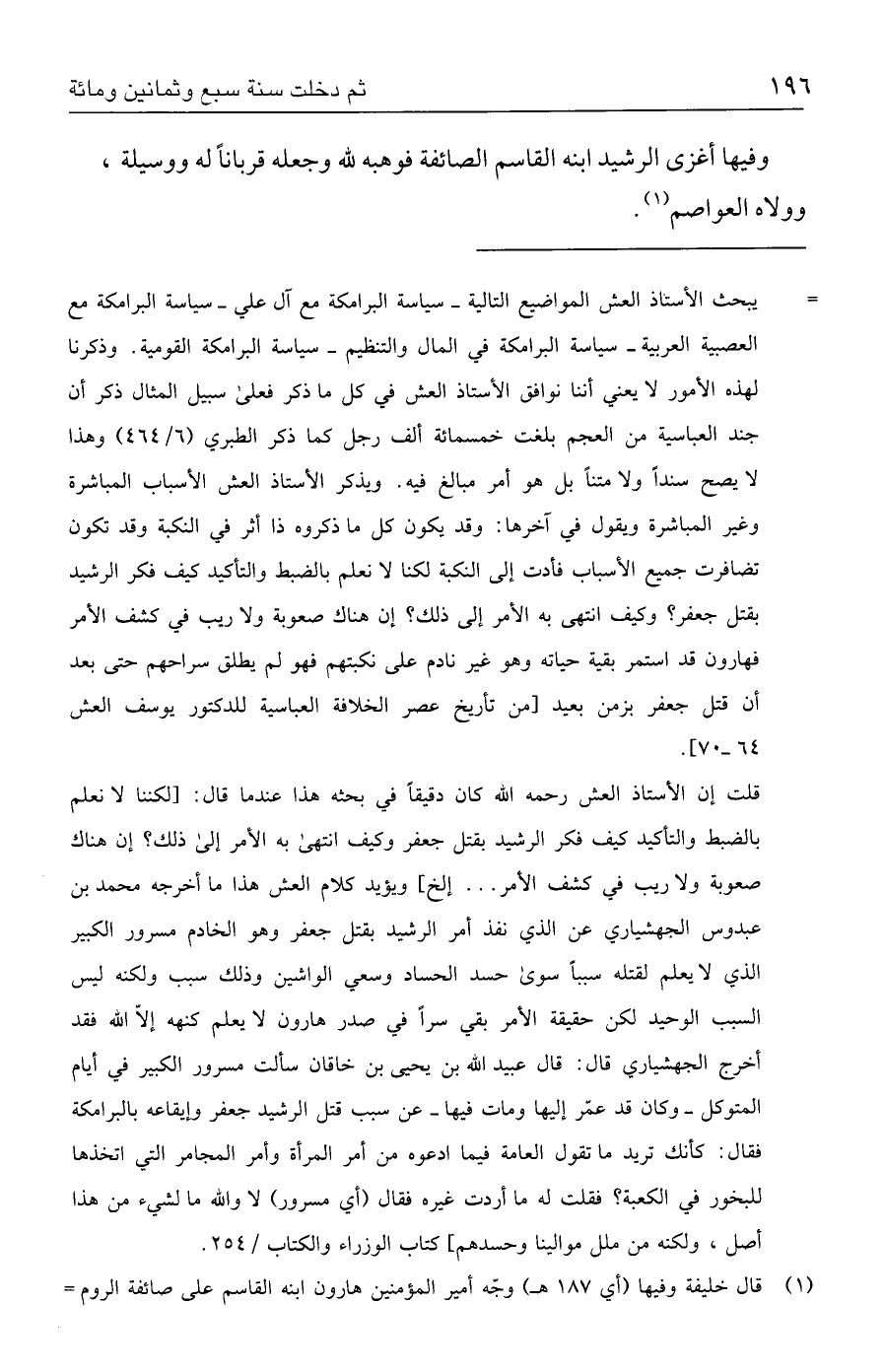 = يبحث الأستاذ العش المواضبع التالية - سياسة البرامكة مع آل علي - سياسة البرامكة مع العصبية العربية - سياسة البرامكة في المال والتنظيم - سياسة البرامكة القومية. وذكرنا لهذه الأمور لا يعني أننا نوافق الأستاذ العش في كل ما ذكر فعلى سبيل المثال ذكر أن جند العباسية من العجم بلغت خمسمائة ألف رجل كما ذكر الطبري (٦/ ٤٦٤) وهذا لا يصح سندًا ولا متنًا بل هو أمر مبالغ فيه. ويذكر الأستاذ العش الأسباب المباشرة وغير المباشرة ويقول في آخرها: وقد يكون كل ما ذكروه ذا أثر في النكبة وقد تكون تضافرت جممع الأسباب فأدت إلى النكبة لكنا لا نعلم بالضبط والتأكيد كيف فكر الرشيد بقتل جعفر؟ وكيف انتهى به الأمر إلى ذلك؟ إن هناك صعوبة ولا ريب في كشف الأمر فهارون قد استمر بقية حياته وهو غير نادم على نكبتهم فهو لم يطلق سراحهم حتى بعد أن قتل جعفر بزمن بعيد [من تأريخ عصر الخلافة العباسية للدكتور يوسف العش ٦٤ - ٧٠].