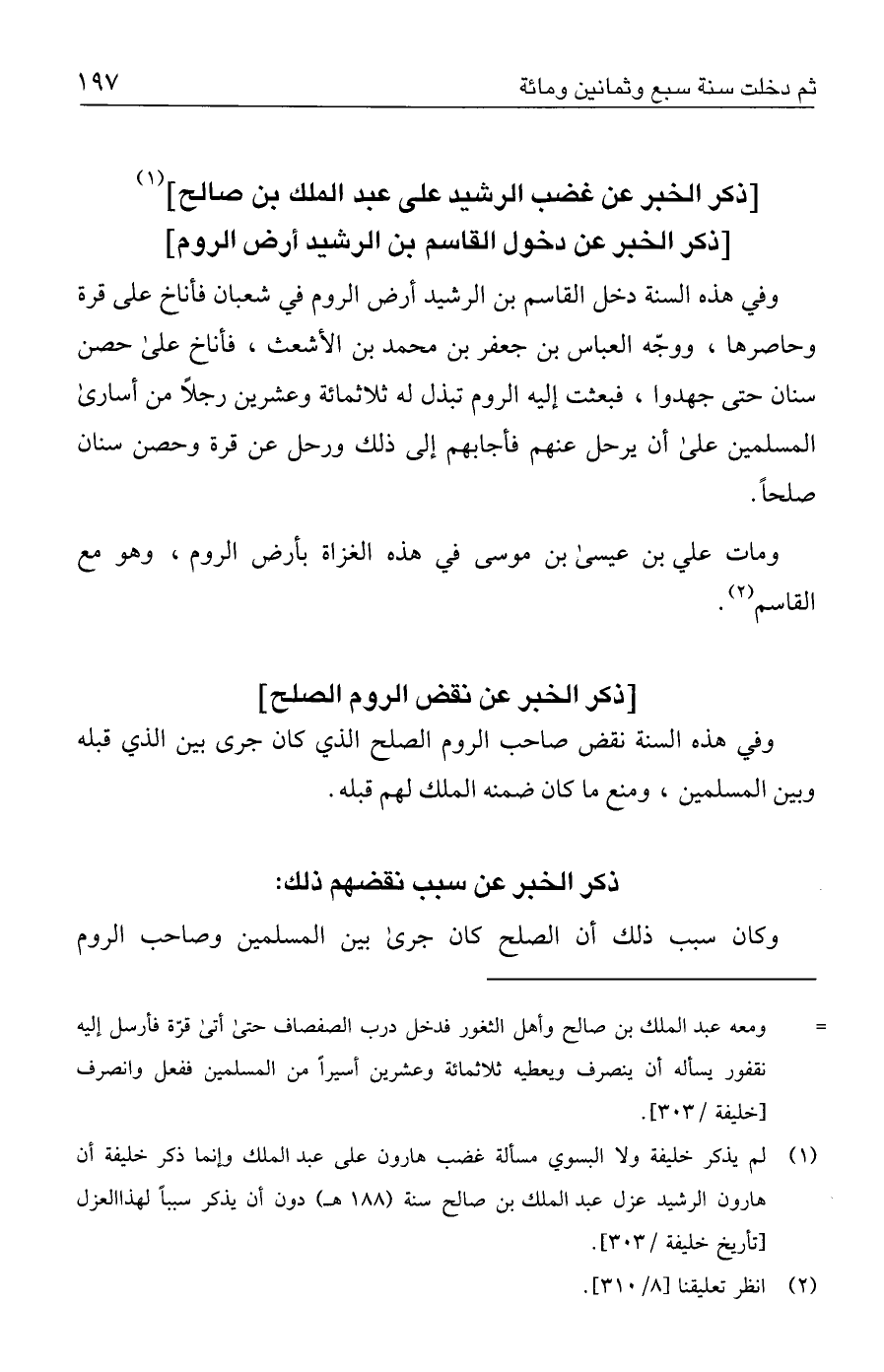 (١) لم يذكر خليفة ولا البسوي مسألة غضب هارون على عبد الملك وإنما ذكر خليفة أن هارون الرشيد عزل عبد الملك بن صالح سنة (١٨٨ هـ) دون أن يذكر سببًا لهذا العزل [تأريخ خليفة / ٣٠٣].