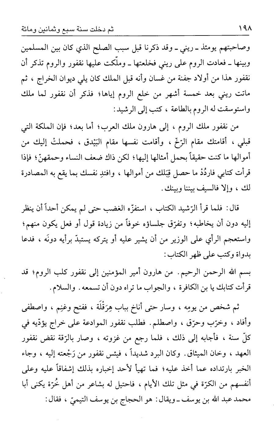 وصاحبتهم يومئذ - ريني - وقد ذكرنا قبل سبب الصلح الذي كان بين المسلمين وبينها - فعادت الروم على ريني فخلعتها - وملّكت عليها نقفور والروم تذكر أن نقفور هذا من أولاد جفنة من غسان وأنه قبل الملك كان يلي ديوان الخراج، ثم ماتت ريني بعد خمسة أشمهر من خلع الروم إياها؛ فذكر أن نقفور لما ملك واستوسقت له الروم بالطاعة، كتب إلى الرشيد: