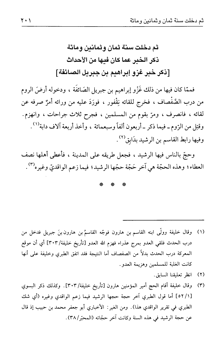 (١) وقال خليفة وولّى ابنه القاسم بن هارون فوجّه القاسمُ بن هارون بنَ جبريل فدخل من درب الحدث فلقي العدو بمرج عذراء فهزم الله العدو [تأريخ خليفة / ٣٠٣] أي أن موقع المعركة درب الحدث بدلًا من الصفصاف أما النتيجة فقد اتفق الطبري وخليفة على أنها كانت الغلبة للمسلمين وهزيمة العدو.