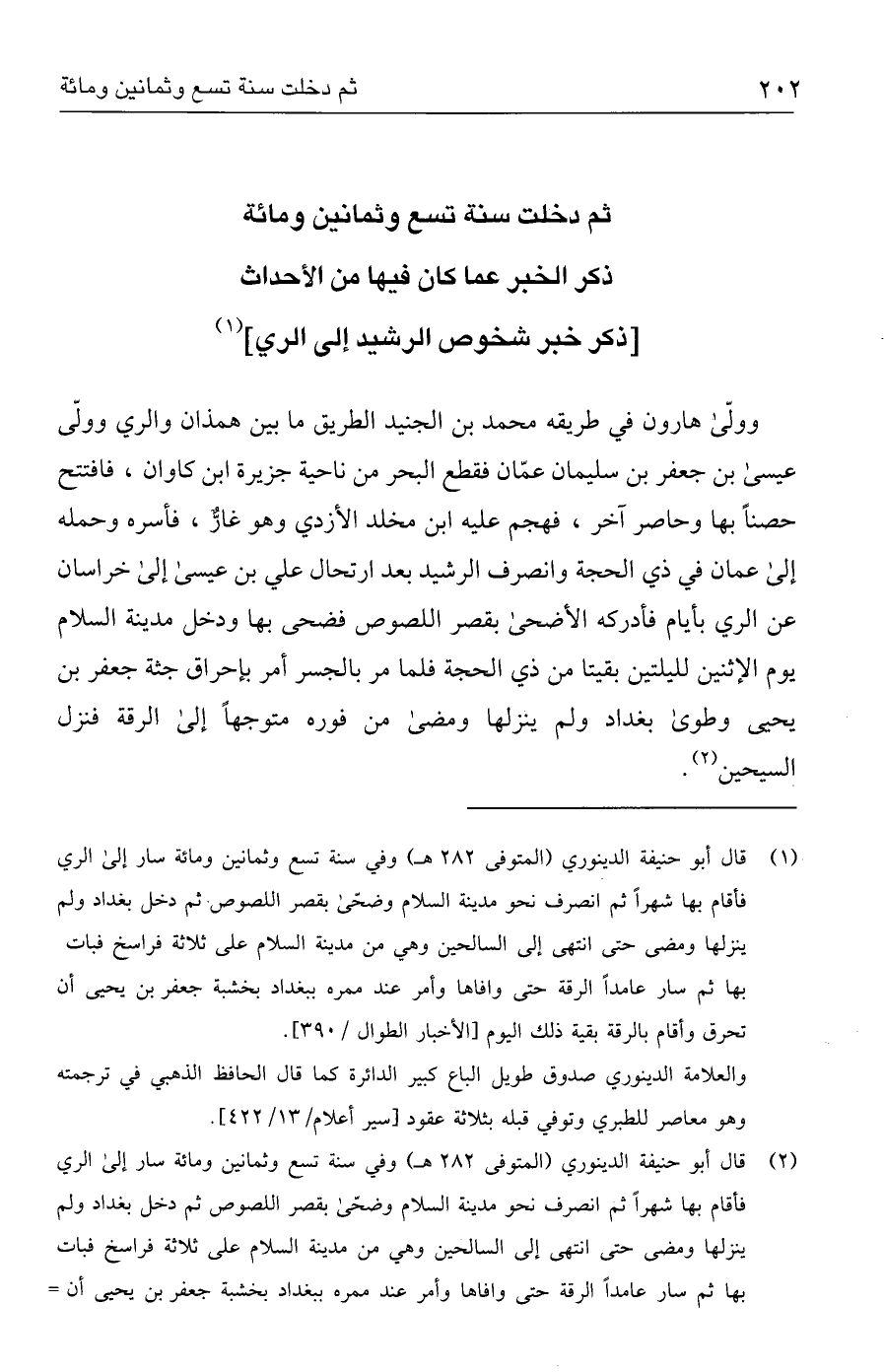 (١) قال أبو حنيفة الدينوري (المتوفى ٢٨٢ هـ) وفي سنة تسع وثمانين ومائة سار إلى الري فأقام بها شهرًا ثم انصرف نحو مدينة السلام وضحّى بقصر اللصوص ثم دخل بغداد ولم ينزلها ومضى حتى انتهى إلى السالحين وهي من مدينة السلام على ثلاثة فراسخ فبات بها ثم سار عامدًا الرقة حتى وافاها وأمر عند ممره ببغداد بخشبة جعفر بن يحيى أن تحرق وأقام بالرقة بقية ذلك اليوم [الأخبار الطوال / ٣٩٠].