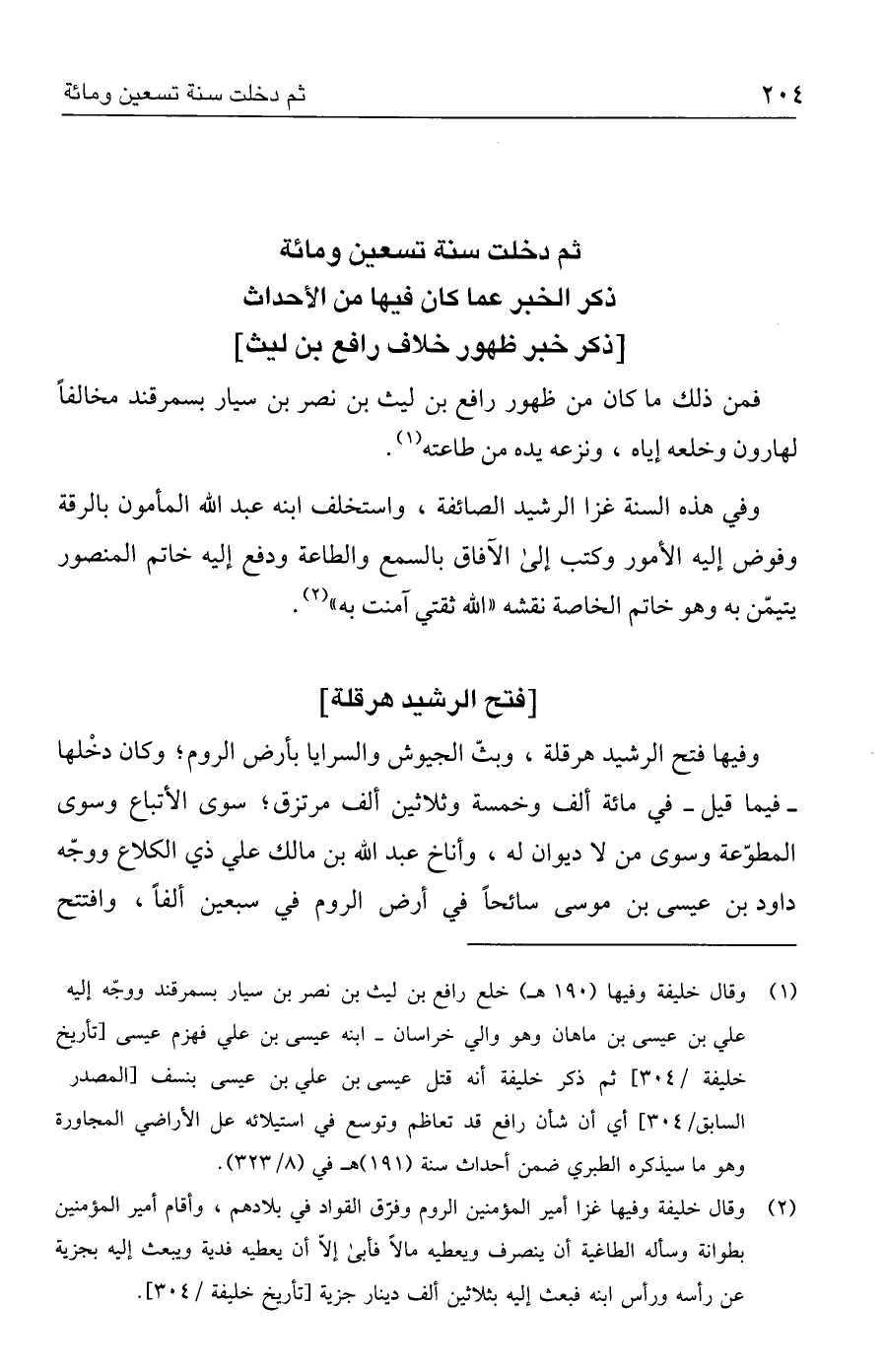 (١) وقال خليفة وفيها (١٩٠ هـ) خلع رافع بن ليث بن نصر بن سيار بسمرقند ووجّه إليه علي بن عيسى بن ماهان وهو والي خراسان - ابنه عيسى بن علي فهزم عيسى [تأريخ خليفة / ٣٠٤] ثم ذكر خليفة أنه قتل عيسى بن علي بن عيسى بنسف [المصدر السابق / ٣٠٤] أي أن شأن رافع قد تعاظم وتوسع في استيلائه عل الأراضي المجاورة وهو ما سيذكره الطبري ضمن أحداث سنة (١٩١) هـ في (٨/ ٣٢٣).