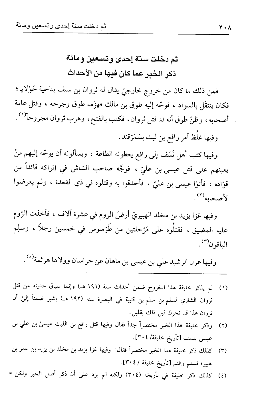 (٢) وذكر خليفة هذا الخبر مختصرًا جدًّا فقال وفيها قتل رافع بن الليث عيسى بن علي بن عيسى بنسف [تأريخ خليفة / ٣٠٤].
